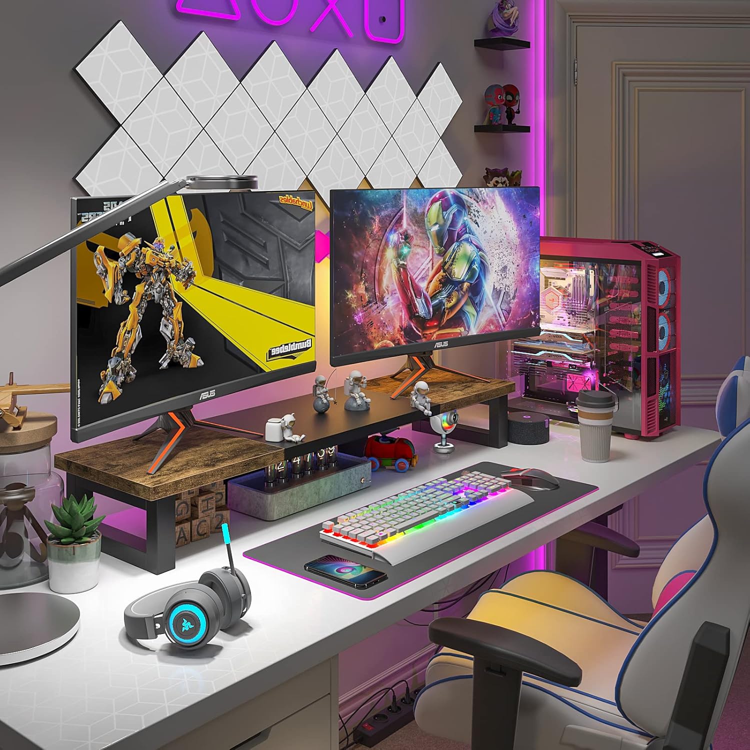 WESTREE Dual Monitor Stand Riser, Wood and Steel Monitor Stand Riser, Computer Monitor Stand for 2 Monitors, Multi-Purpose Desktop Storage Stand for Computer,Laptop,Printer,TV