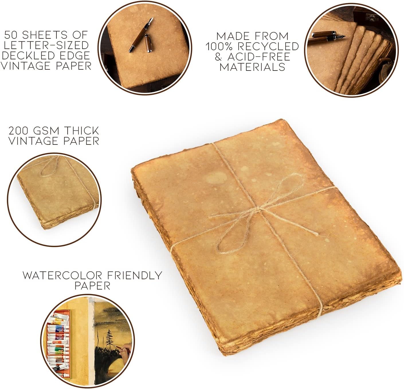 - 200 GSM LETTER SIZED PAPER - These papers are made from 100% recycled and acid-free materials, 200 GSM. Each pack contains 50 sheets and each sheet is 11" long 8.5" wide. Ancient Looking Paper which looks like it was pulled out from history, will last for generations.
