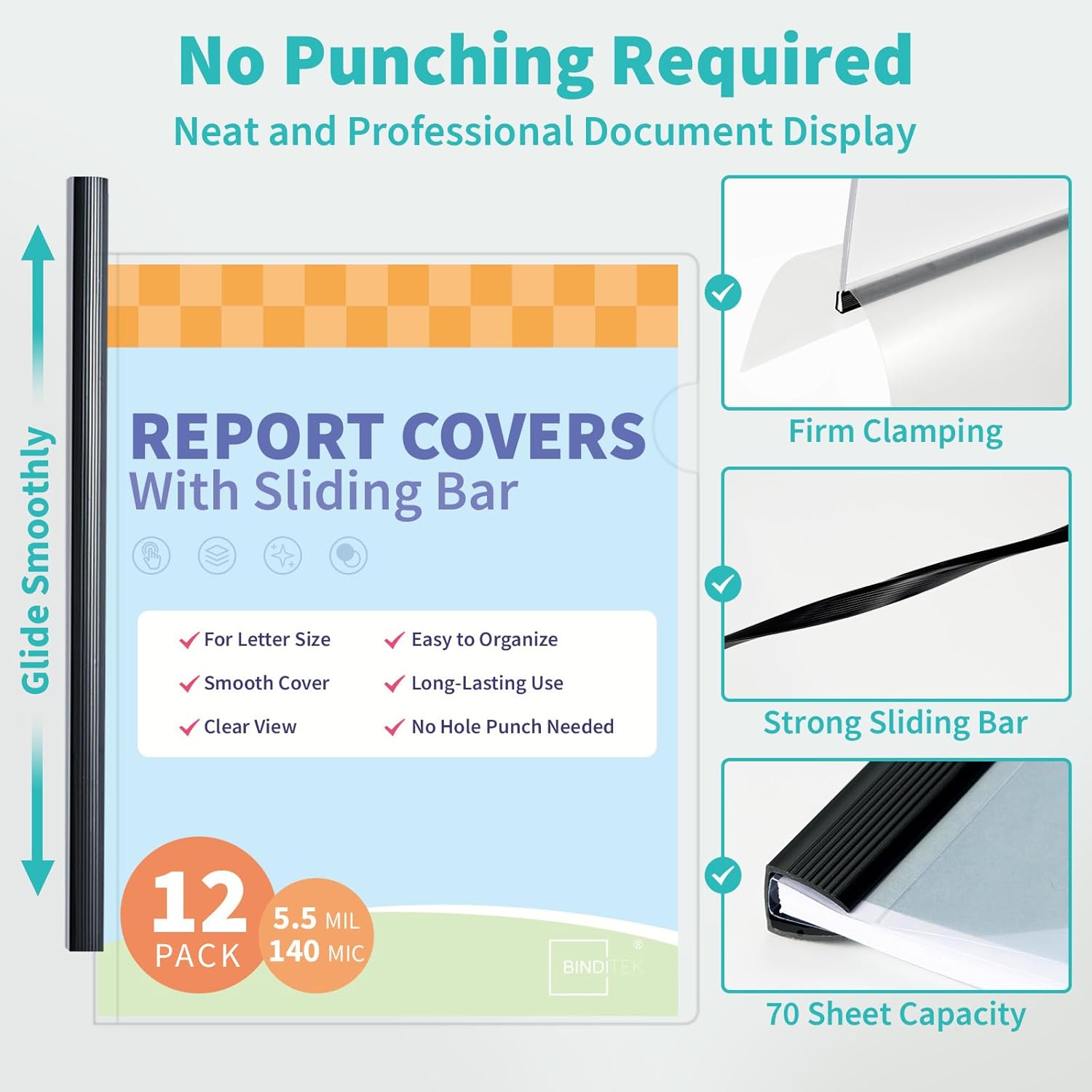 - 【70 Sheet Capacity】 The 9 mm sliding bar holds up to 70 sheets of 20 lb paper, offering a compact and practical solution for daily document organization. The 5.5 mil (140 mic) clear cover resists bending, tearing, and moisture, keeping files in good condition. Rounded corners offer a smooth touch and help prevent paper damage. Lightweight and portable, suitable for quick presentations and reports.