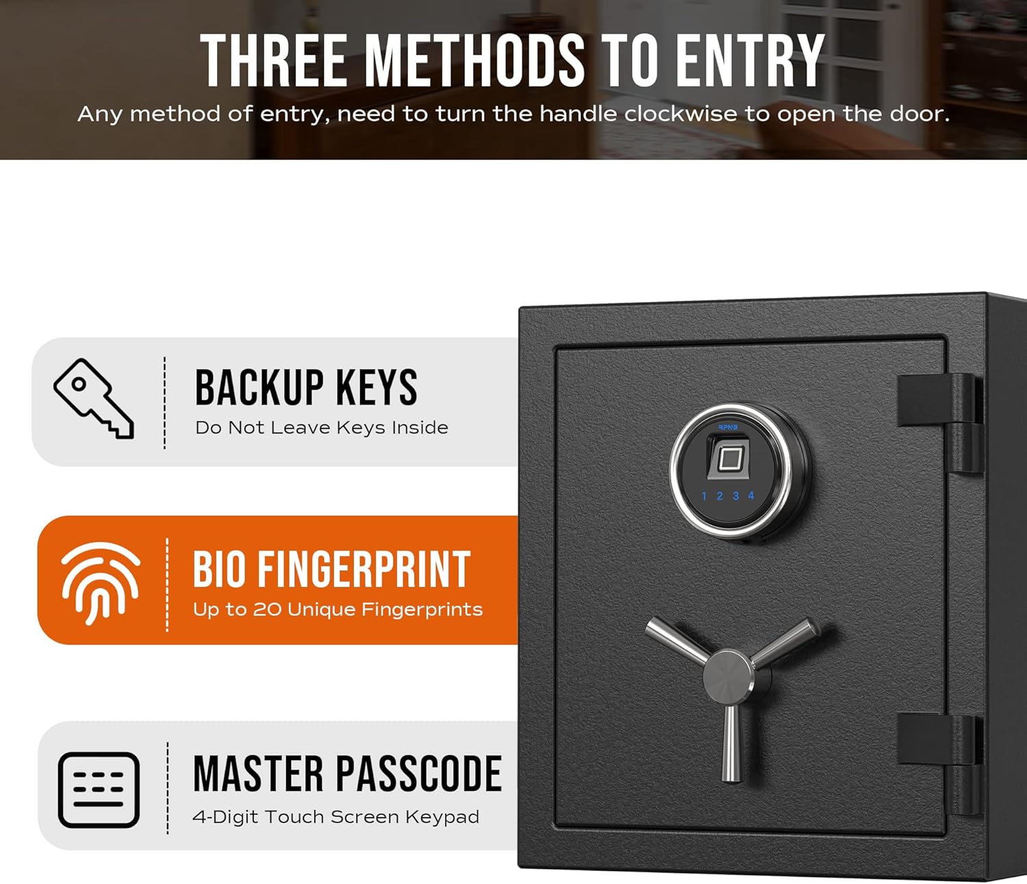 - Multi-Method Entry: Equipped with the advanced 500 DPI biometric fingerprint sensor, 4-digit smart touchscreen keypad, and two backup keys. You need to turn the 3-spoke safe handle clockwise for any method of entry to open the door. The fireproof lock box is designed with an outside battery compartment, make battery replacement more convenient in the emergency situation