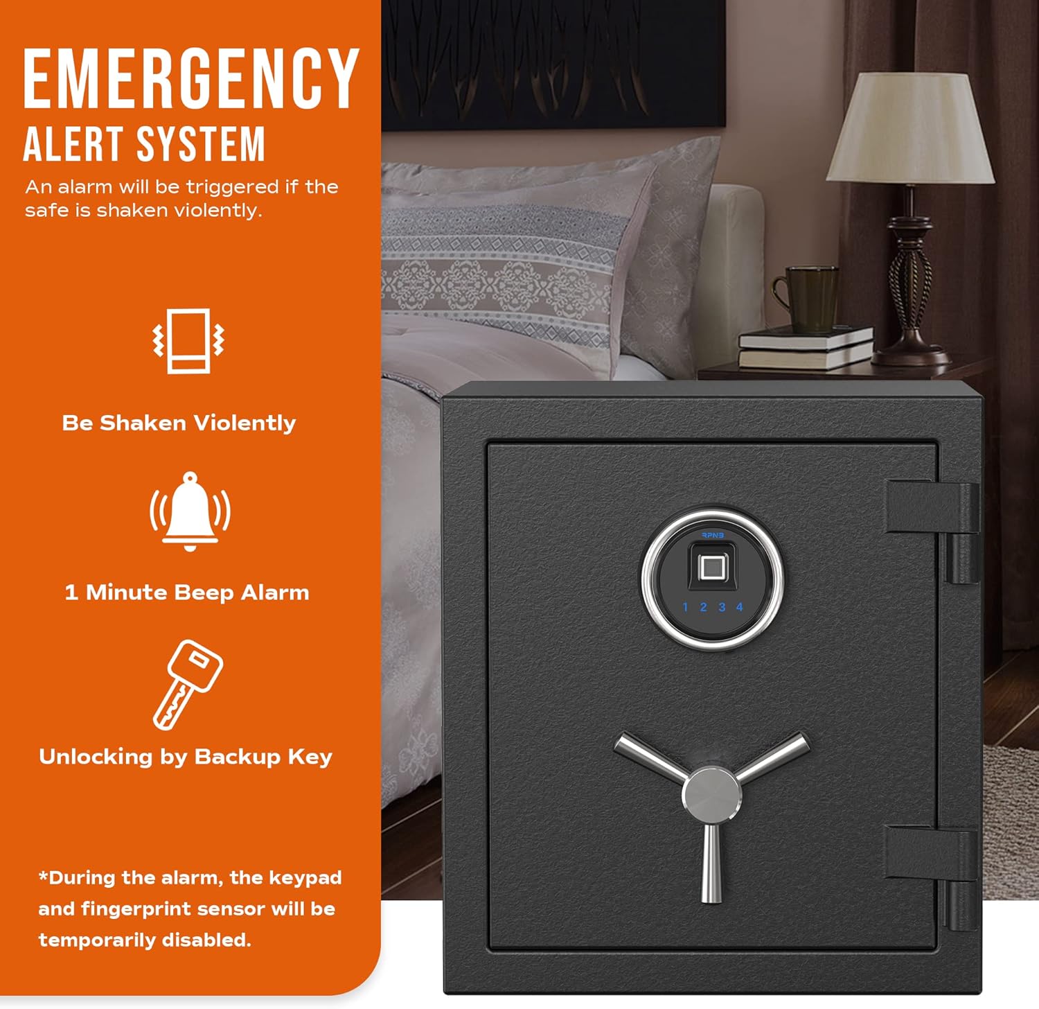- Emergency Alert System and Silent Mode: This fireproof safe box can be set the vibration alarm to improve the safety. An alarm will be triggered if the safe is shaken violently. During the alarm, the keypad and fingerprint sensor will be temporarily disabled. After setting up Silence Mode, you can mute the sound of the tone for silent entry