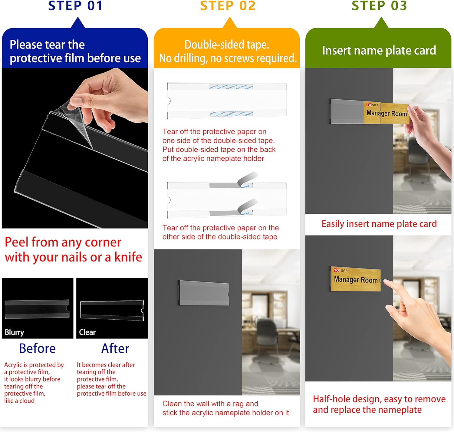 - Set: 12 pieces of sized 8 "x2" wall mounted acrylic nameplates, and 24 pieces of double sided tape.