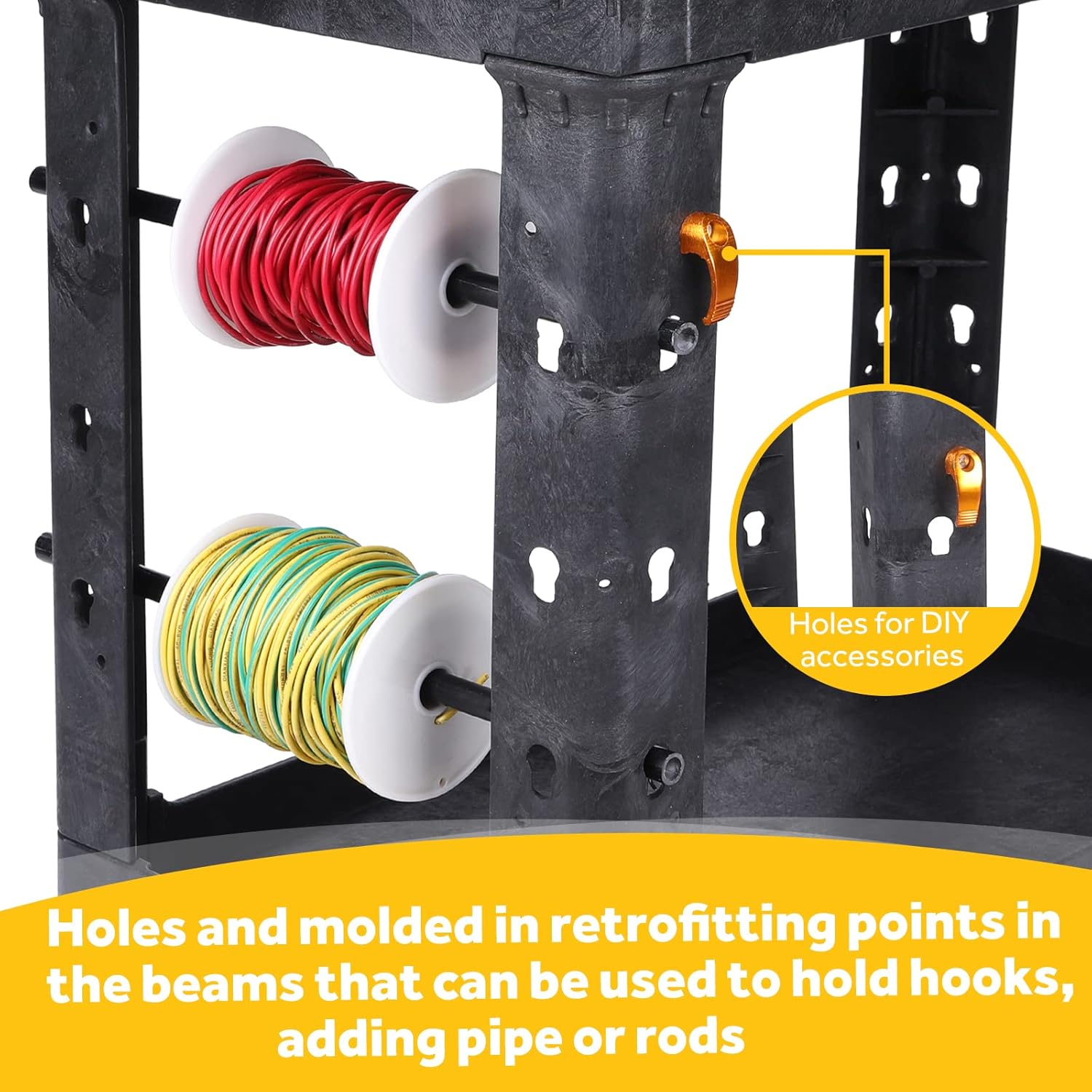 - ๐ ERGONOMIC HANDLE AND CUSTOMIZABLE FITTINGS: Our service cart ergonomic push handle is molded into top shelf with a built-in storage compartment, which provides optimum hand placement and pushing height to improve control & worker safety. Molded In Retrofitting Points in beams allow you to add pipe or rods to hold wire spools and other roll type goods.