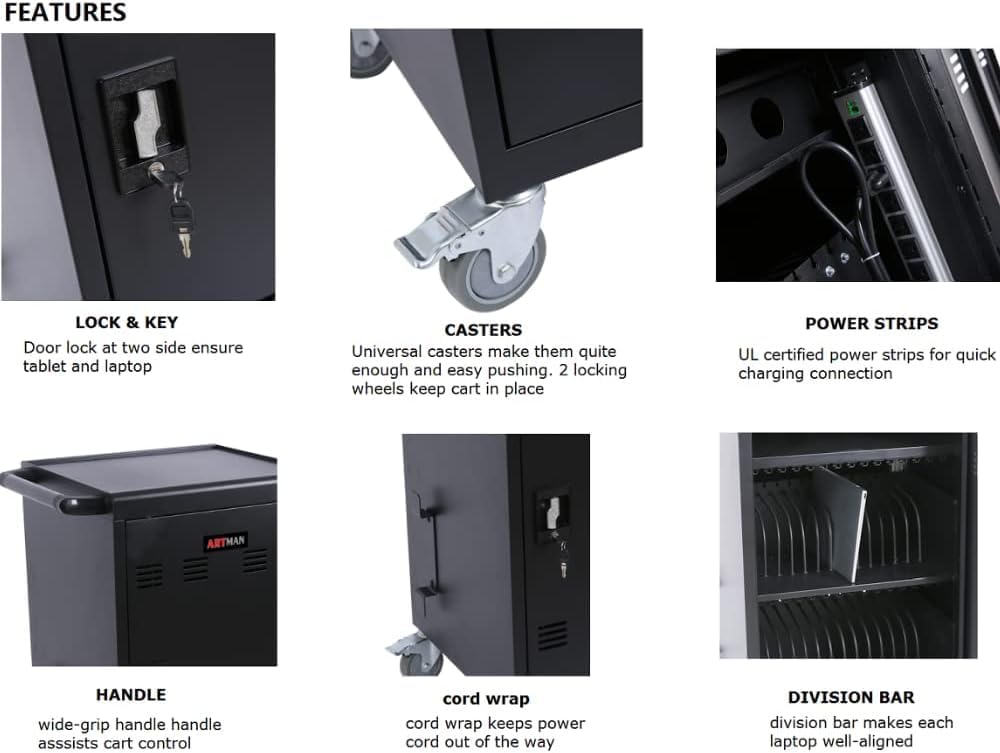- LOCKING & SAFETY : Charging cart with lock & key for the front and back door, will protect your devices when it's in working or you are moving the cart. And 2 locking caster wheels will keep cart in place.