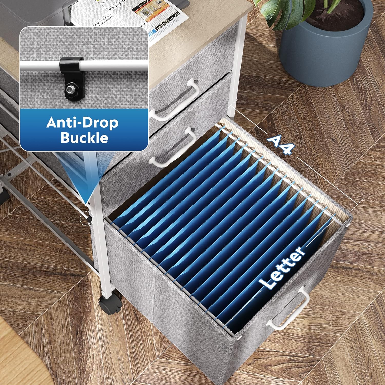 - Easy to Move: Rolling on 4 wheels, this mobile file cabinet can fix or move around your home office freely. Built-in brakes on front 2 casters to keep it in position and add stability. Unique fabric drawer design makes it only weigh 22 lbs. and light to move.