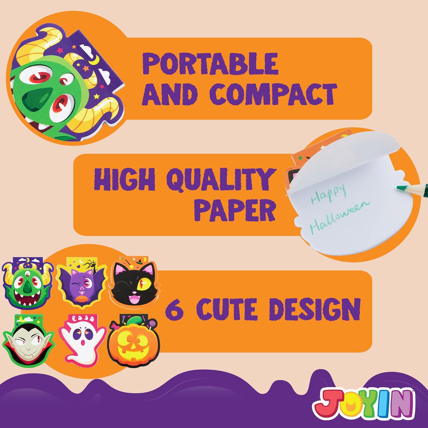 - Value Set. Our Halloween notepad comes with 60 pieces of halloween character mini notepads. These character notepad sets come with 6 spooky designs: pumpkin, cat, bat, vampire, ghost, and monster. Cute and attractive designs of mini notebooks for kids, adding more Halloween atmosphere.