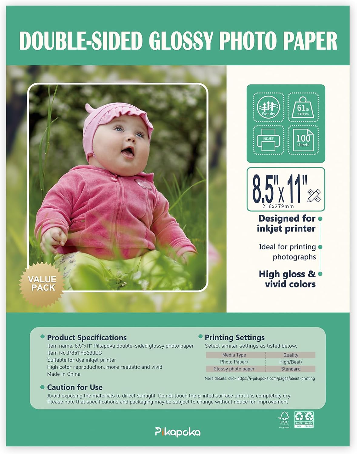 - Pikapoka Double-Sided Glossy Photo Paper:letter size (8.5 x 11 inches), 100 sheets per pack, 61lb/230gsm.