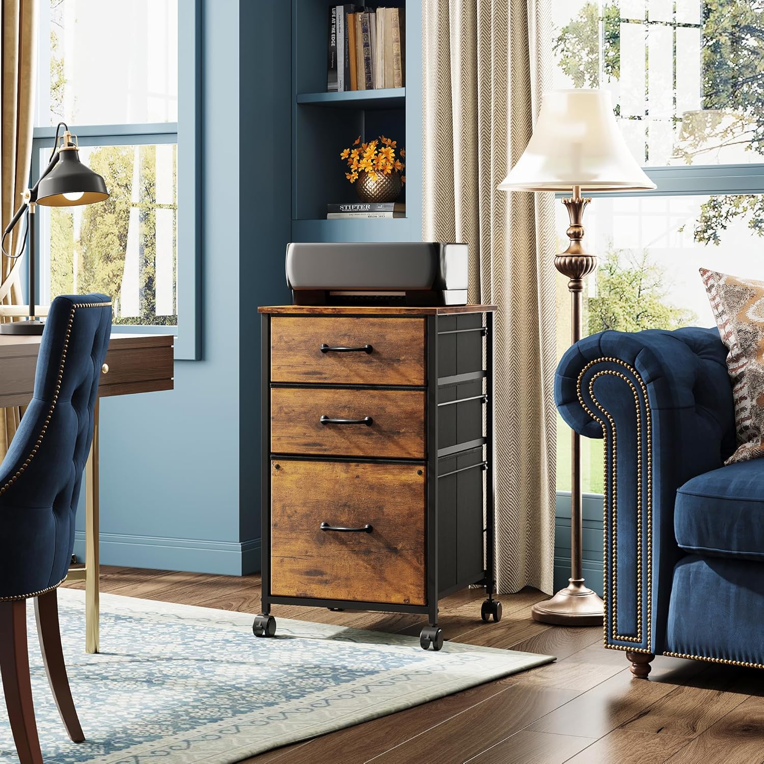 DEVAISE Mobile File Cabinet, Rolling Printer Stand with 3 Drawers, Fabric Vertical Filing Cabinet fits A4 or Letter Size for Home Office, Rustic Brown Wood Grain Print