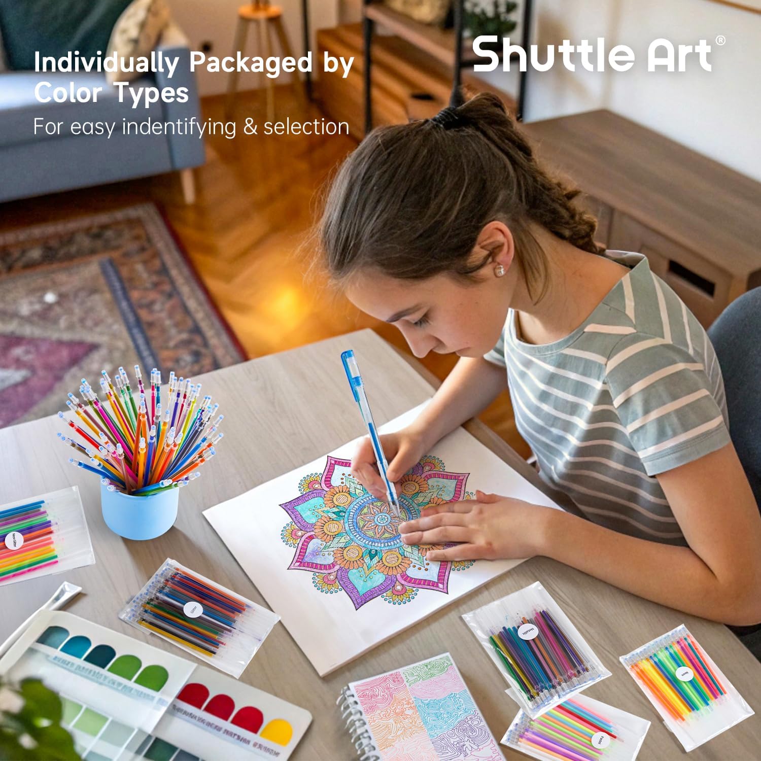 - 180 UNIQUE COLORS: Shuttle Art Gel Pen Refills Set has 180 unique colors, including 7 color types: glitter, neon glitter, metallic, neon, pastel, swirl, standard. Abundant colors with varied color types, fully meet your demands of coloring, writing and drawing.