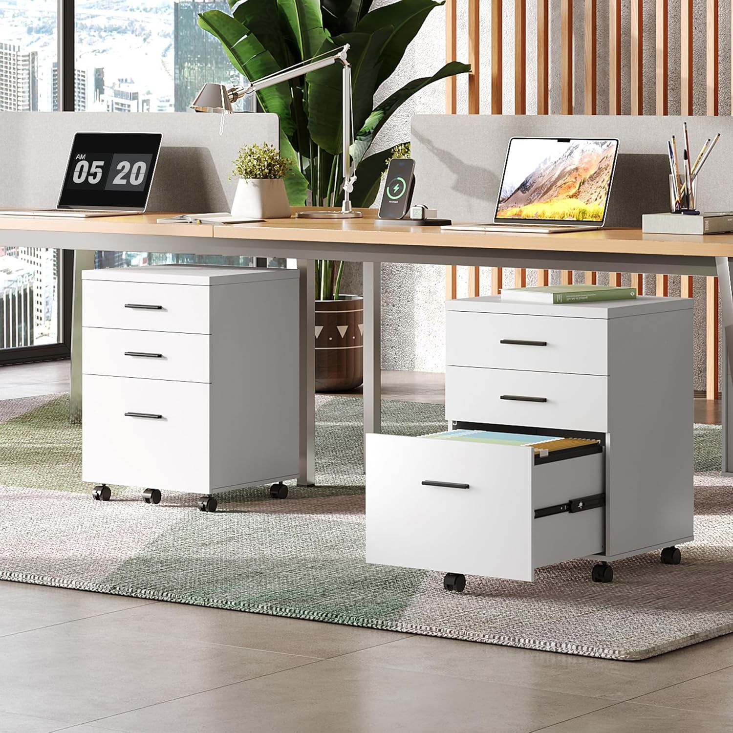 DEVAISE 3 Drawer File Cabinet for Home Office, Wood Under Desk Filing Cabinet, Rolling Printer Stand with Wheels, White