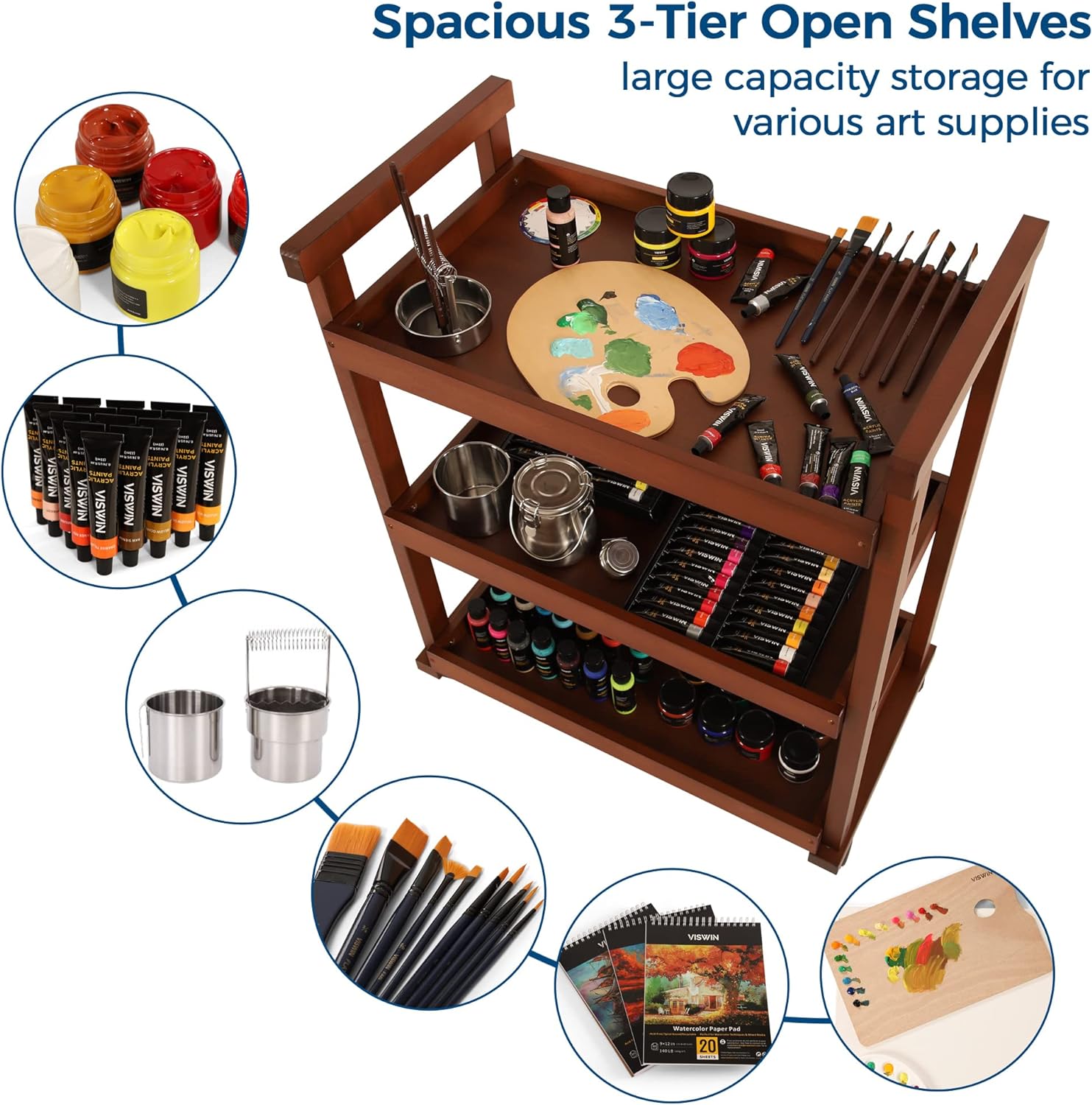 - 3-TIER SPACIOUS STORAGE CART: Our utility cart has 3 spacious open shelves to store your canvas, paintbrushes, paints, or other art supplies, even your daily necessities. This large capacity rolling cart allows you to focus on your artwork and is designed to keep all of your creative supplies organized and easily accessible