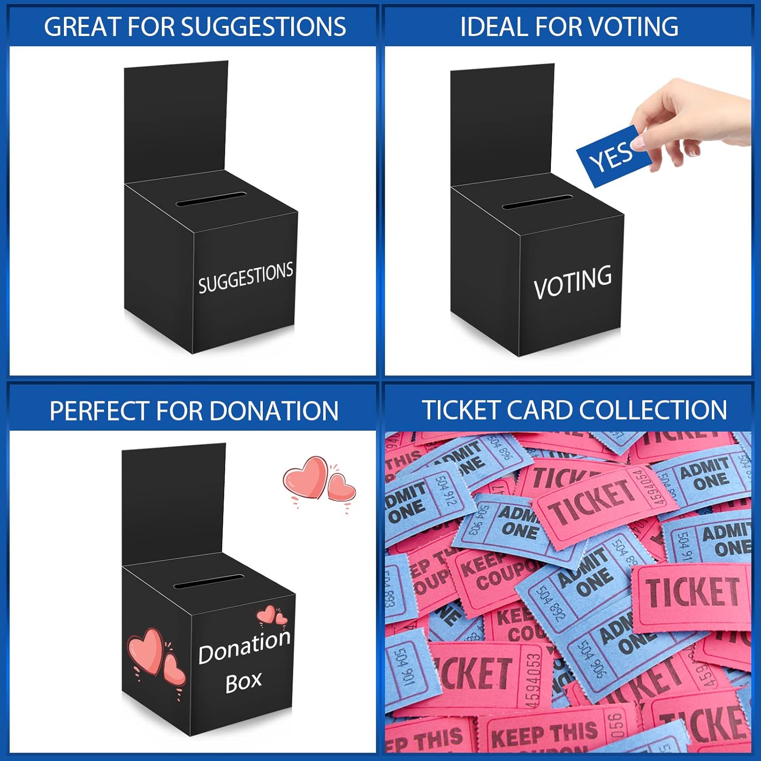 - WIDELY USES:These boxes can be used as voting box, fundraiser box, ballot box cardboard, suggestion box paper, ticket drawing box, cardboard donation box, raffle ticket boxes,cardboard suggestion box, contest entry box,wedding reception tip box card box , diaper raffle box for baby shower, prize baskets for raffle prizes wedding reception and more