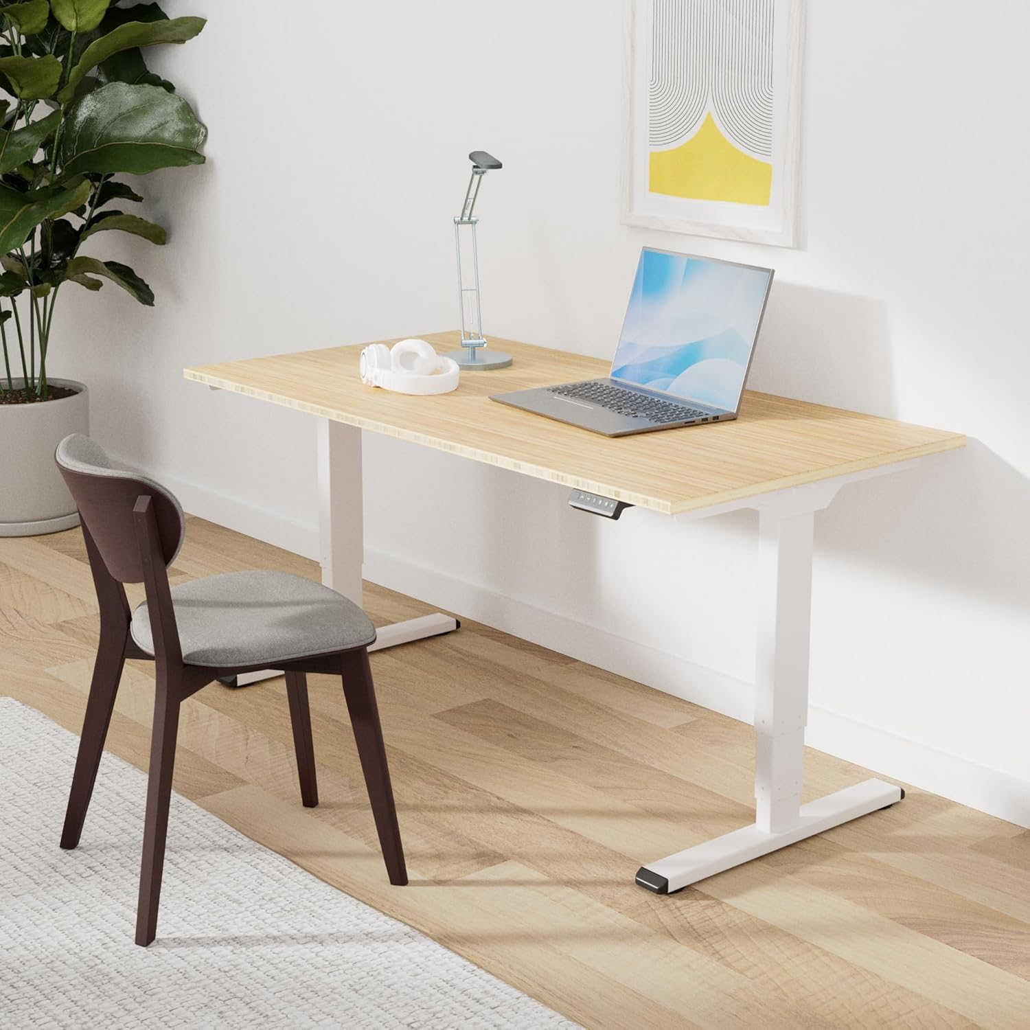 SANODESK 55 Inch 3 Stage Bamboo Electric Standing Desk, Dual Motor Height Adjustable Desk, Whole-Piece Desktop Sit to Stand Home Office Desk (White Frame/ 55” x 28” Natural Bamboo Top)