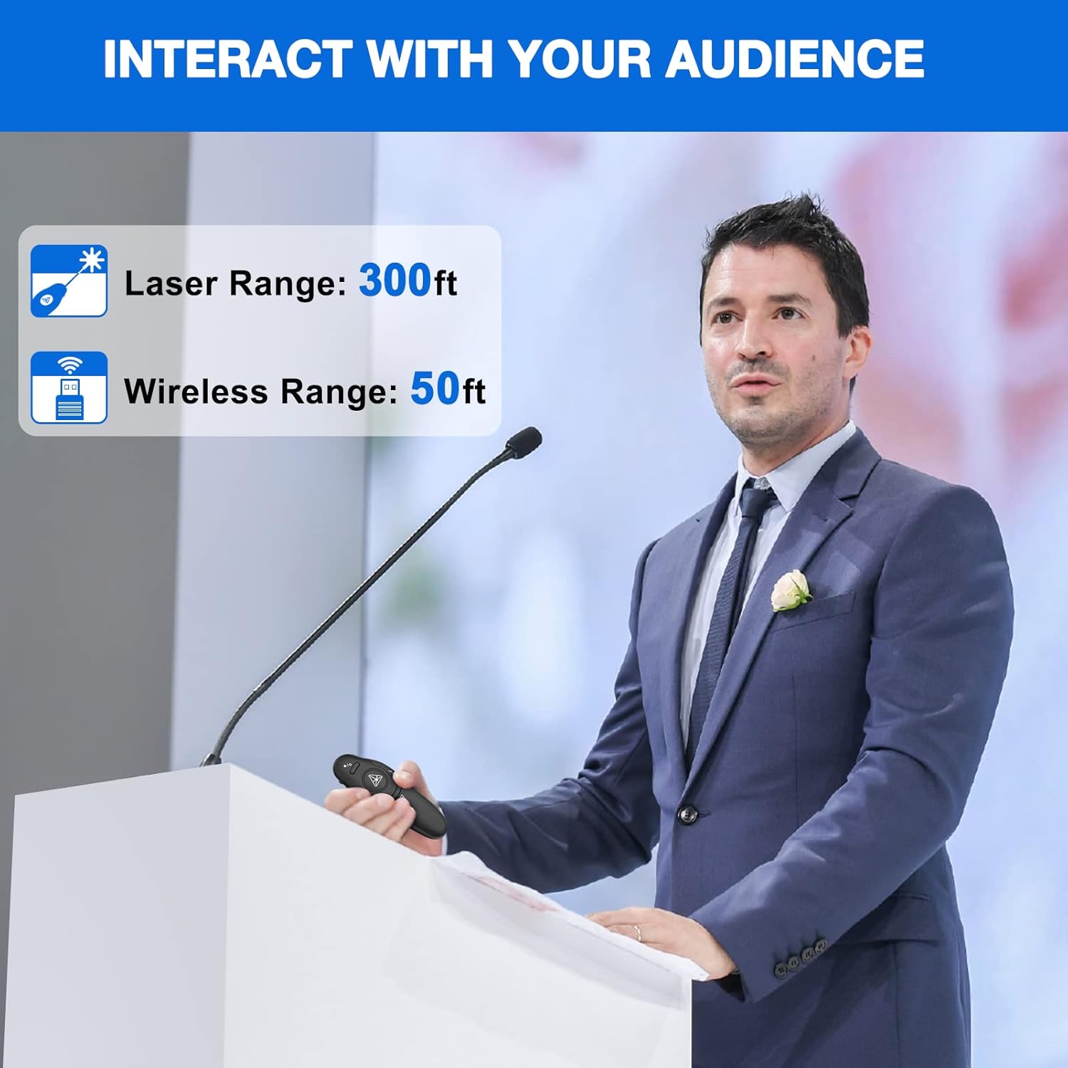 - 50FT WIRELESS REMOTE CONTROL DISTANCE & 300FT LASER DISPLAY RANGE: Wireless presenter remote control distance range of up to 50-foot, so you can move around the room and interact with your audience. The bright red laser pointer that's easy to highlight key areas of your slides. You can continue to control the slides PPT without back to computer