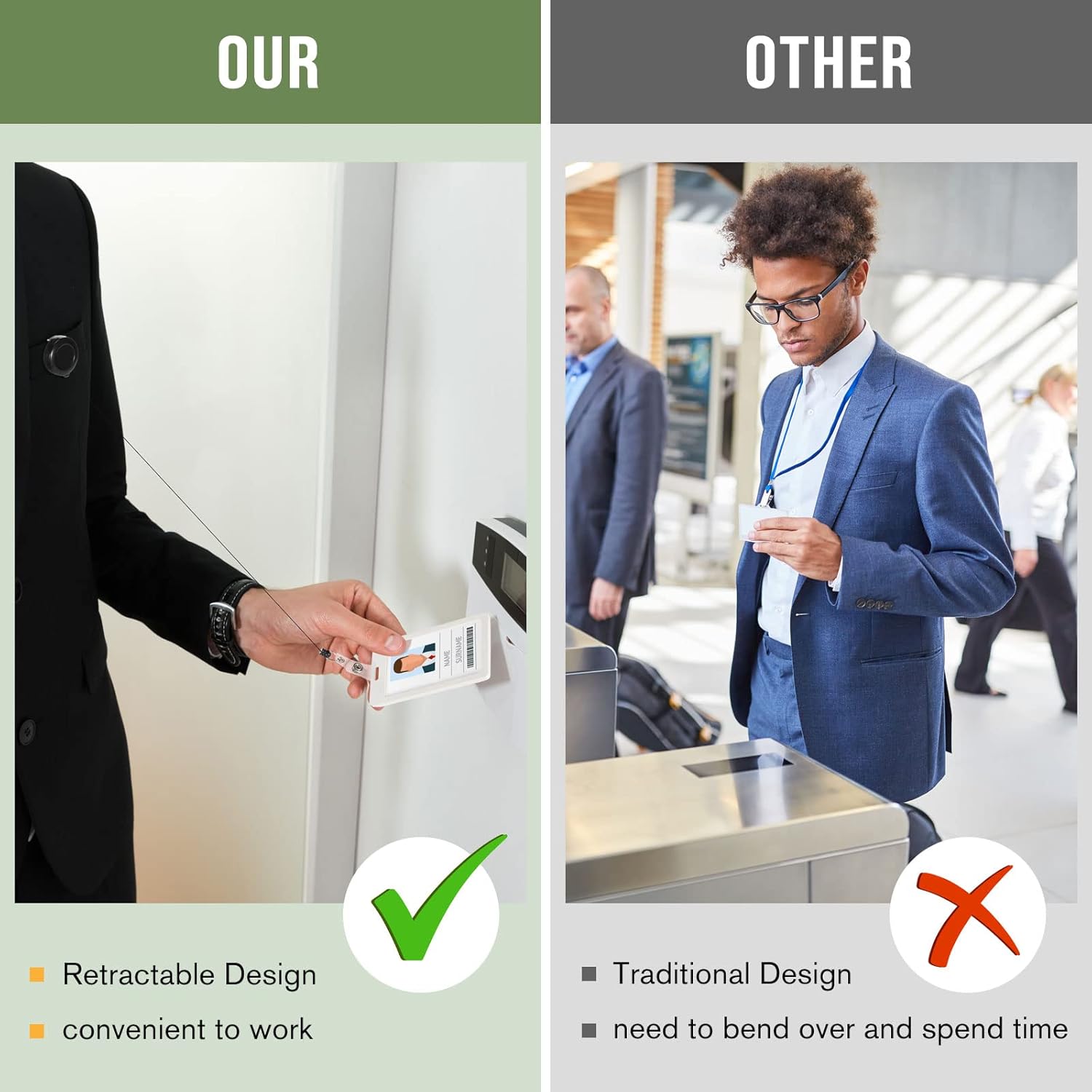 - Retractable Design: Each retractable ID badge holder features a 66 cm (26 in) nylon cord, strong and durable. Easily extend to scan your ID without removing itβfast, convenient, and worry-free for everyday use