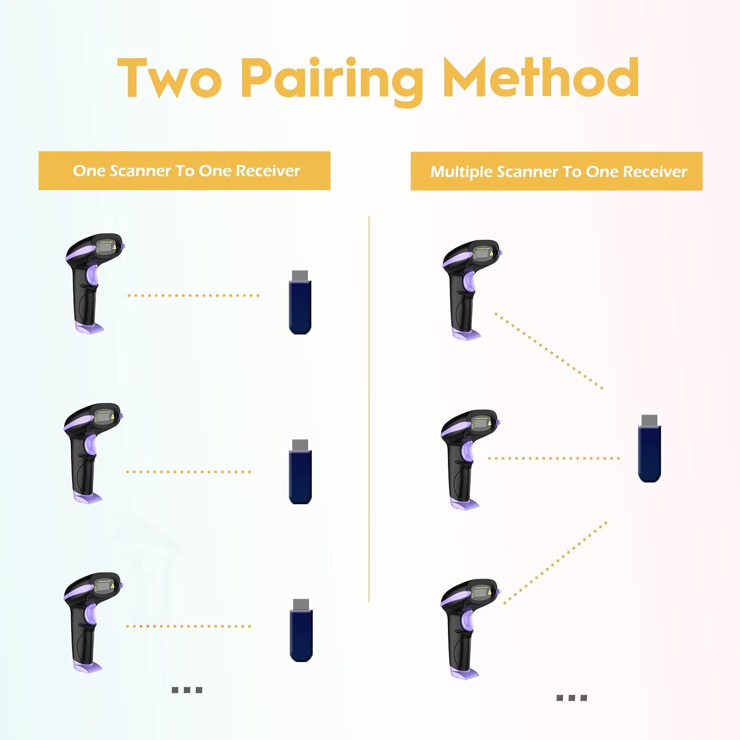 - Two paring mode: One-to-one mode, Multiple-to-one mode. At one-to-one mode,one scanner only transmit barcode to the one usb receiver. AT Multiple-to-one mode,Multiple scanners can transmit barcode to the one usb receiver - ideal in a warehouse where several people are scanning at once.