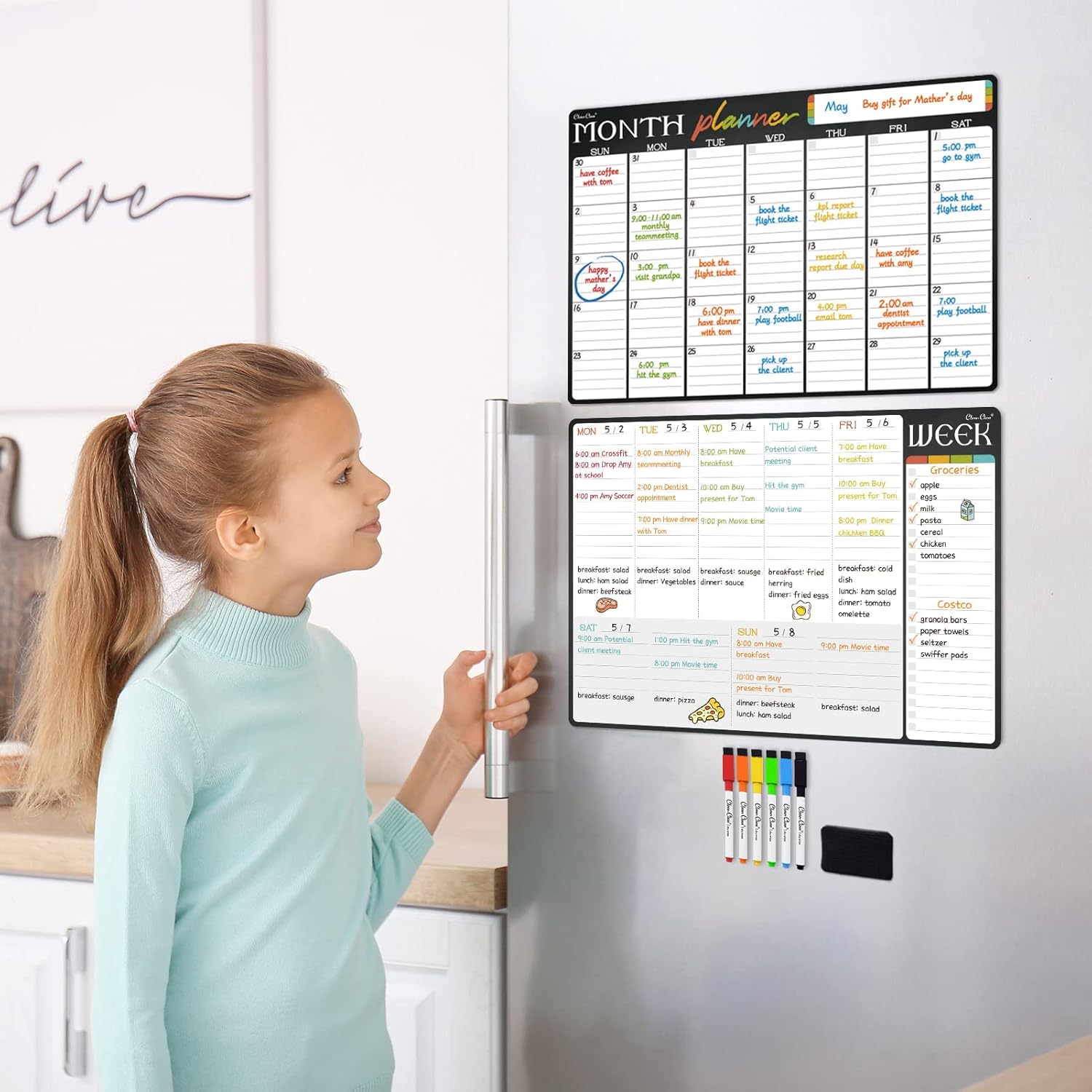 Magnetic Dry Erase Monthly and Weekly Calendar - 17"x12" Monthly and Weekly Whiteboard for Fridge - 6 Extra Fine Point Markers Included - Shipped Flat