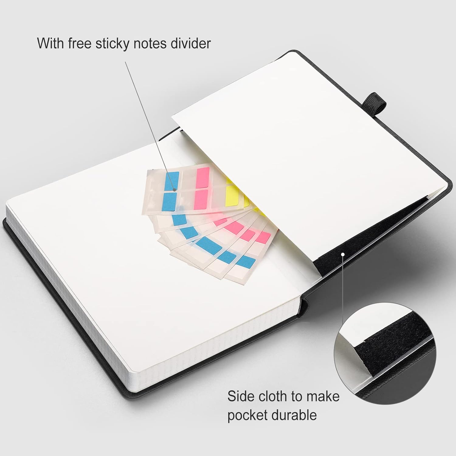 - Humanized Design: Divider sticky notes and 2 bookmarks help you find important content faster. Journal stencil included, an ideal tool for bullet journaling. Back inner pocket holds notes, business cards, small gadgets, etc. Closes with an elastic band and has a pen holder loop for any pen