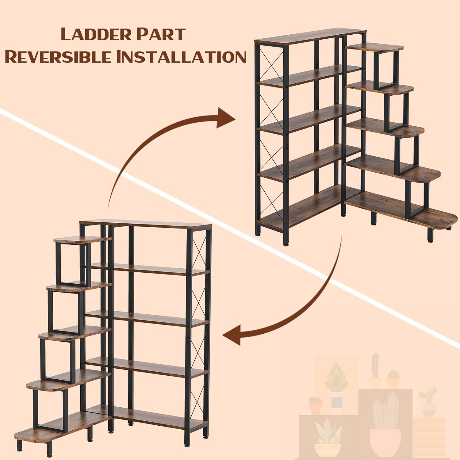 Large Corner Bookshelf Bookcase, Industrial Reversible 5 Tier Ladder Shelves Storage Display Rack with Metal Frame, Modern Home Office Furniture for Living Room Bedroom