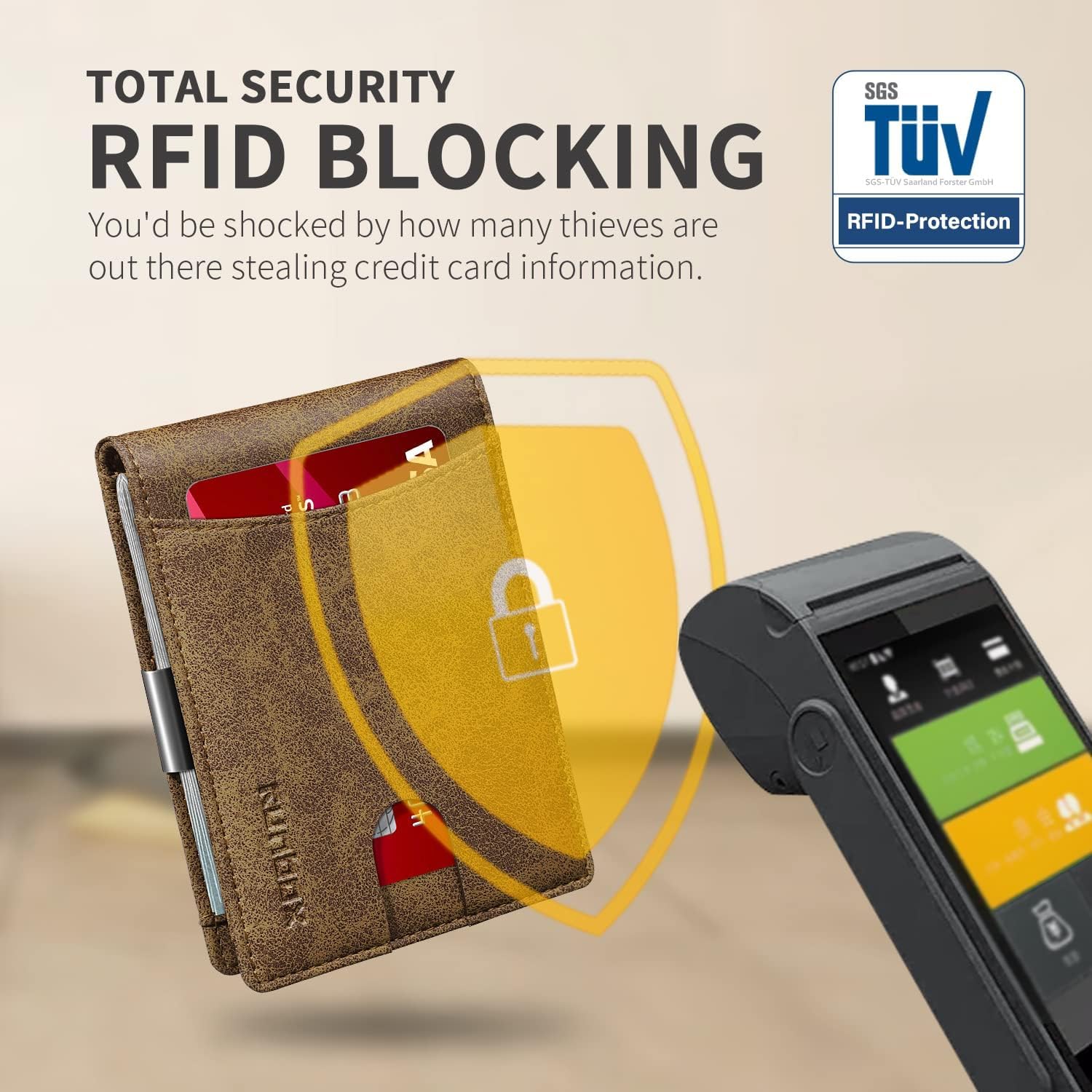 - RFID Anti-Theft SECURITY - This slim wallet for men is equipped with German Institute Certified RFID Security technology, a unique metal composite, engineered specifically to block 13.56 MHz or higher RFID signals to protect the valuable information and privacy