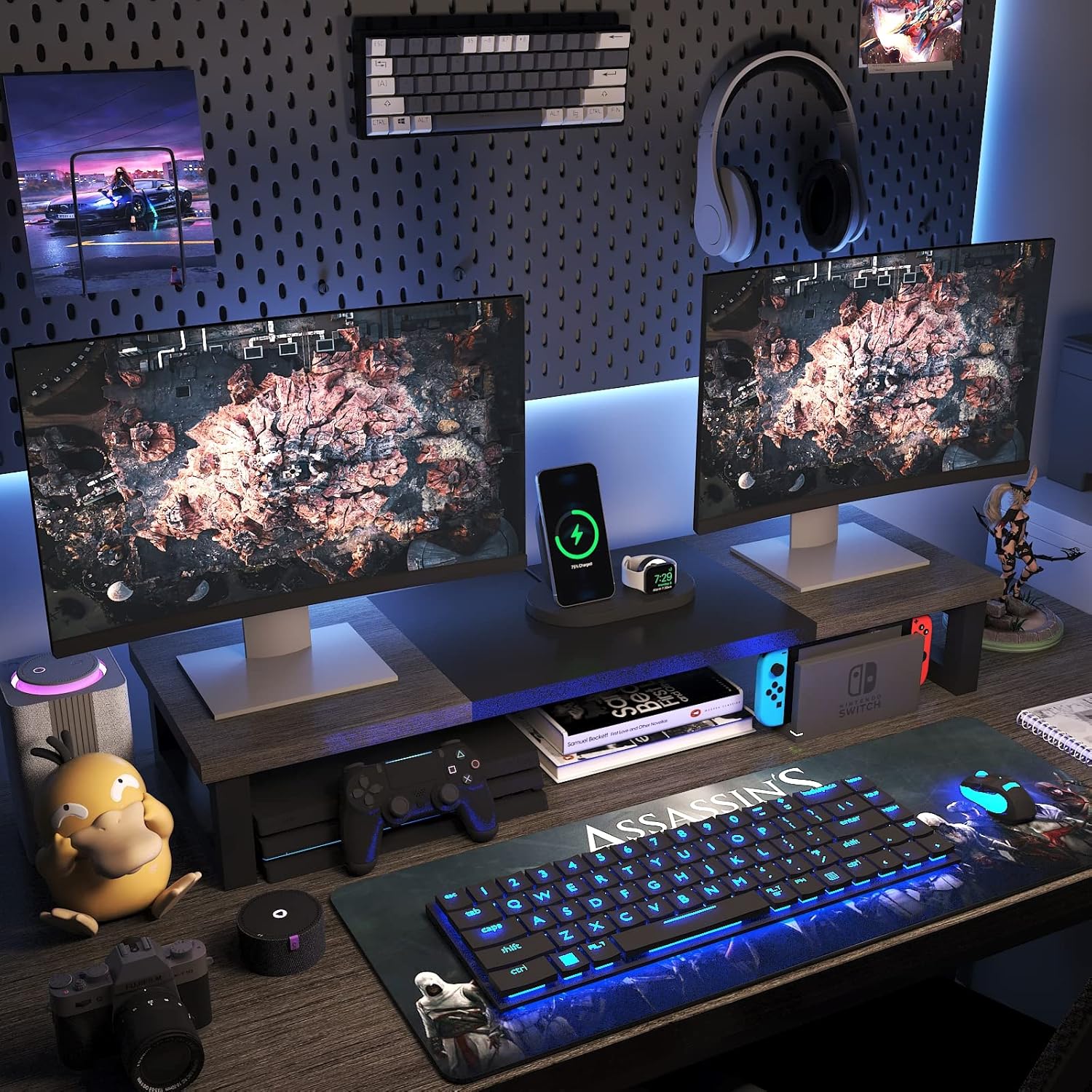 WESTREE Dual Monitor Stand Riser, Wood and Steel Monitor Stand Riser, Computer Monitor Stand for 2 Monitors, Multi-Purpose Desktop Storage Stand for Computer,Laptop,Printer,TV