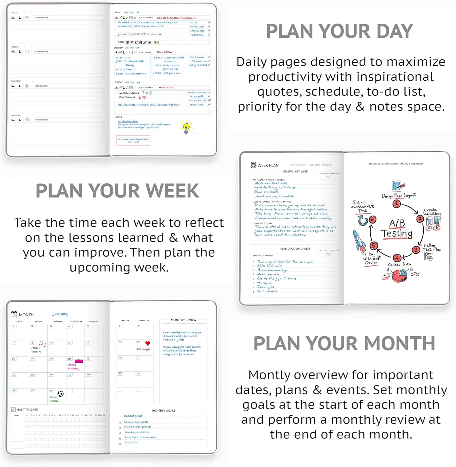 - START ANYTIME & STAY CONSISTENT – With 52 weeks of undated daily planning pages, plus weekly and monthly review sections. You can begin anytime, improve your time management and build a consistent planning habit on your own terms.