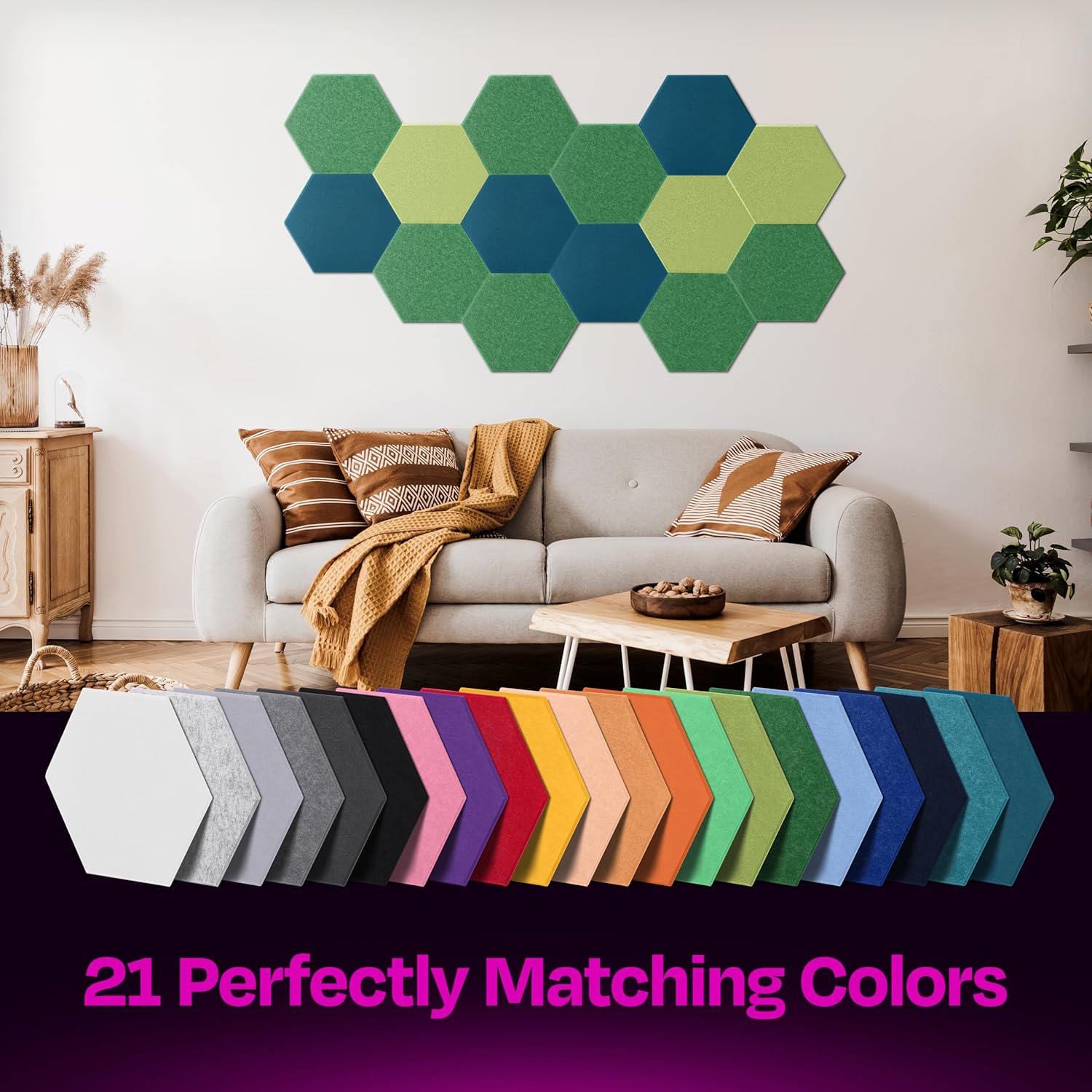 - 【SUPERIOR NOISE REDUCTION PANELS】: Each soundproofing panel is precisely cut of high-density, 5.9oz/ft^2 (1800gr/m^2) poly-fiber panels. Our sound proofing padding for wall reach a NRC rating of up to 0.95, making a big difference to the sounds we hear around us. Pick these hexagon acoustic panels over the old acoustic foam panels and create a beautiful room with superior sound quality.