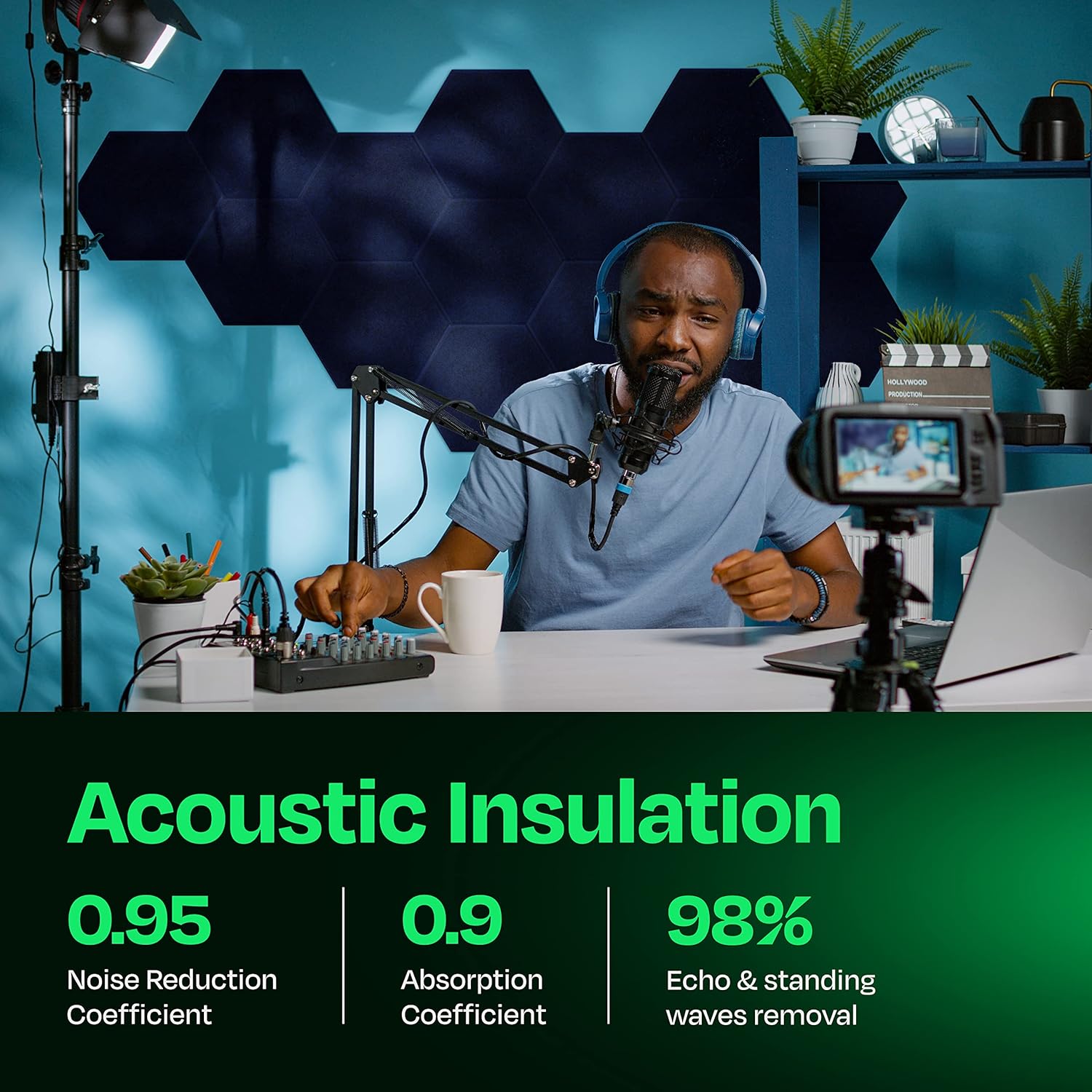 - 【SUPERIOR NOISE REDUCTION PANELS】: Each soundproofing panel is precisely cut of high-density, 5.9oz/ft^2 (1800gr/m^2) poly-fiber panels. Our sound proofing padding for wall reach a NRC rating of up to 0.95, making a big difference to the sounds we hear around us. Pick these hexagon acoustic panels over the old acoustic foam panels and create a beautiful room with superior sound quality.