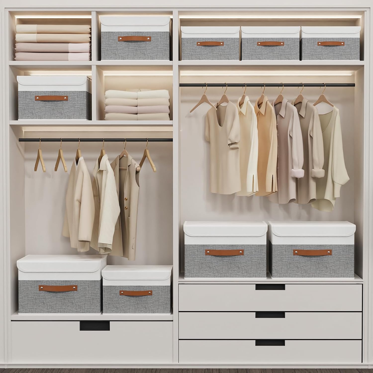 - Design of Storage Box Handle: The clothes storage bin has 1 widened and thickened faux leather handles, brown leather handles add a classic touch, allowing to lift or move the large storage boxes easily, which are hard to be broken