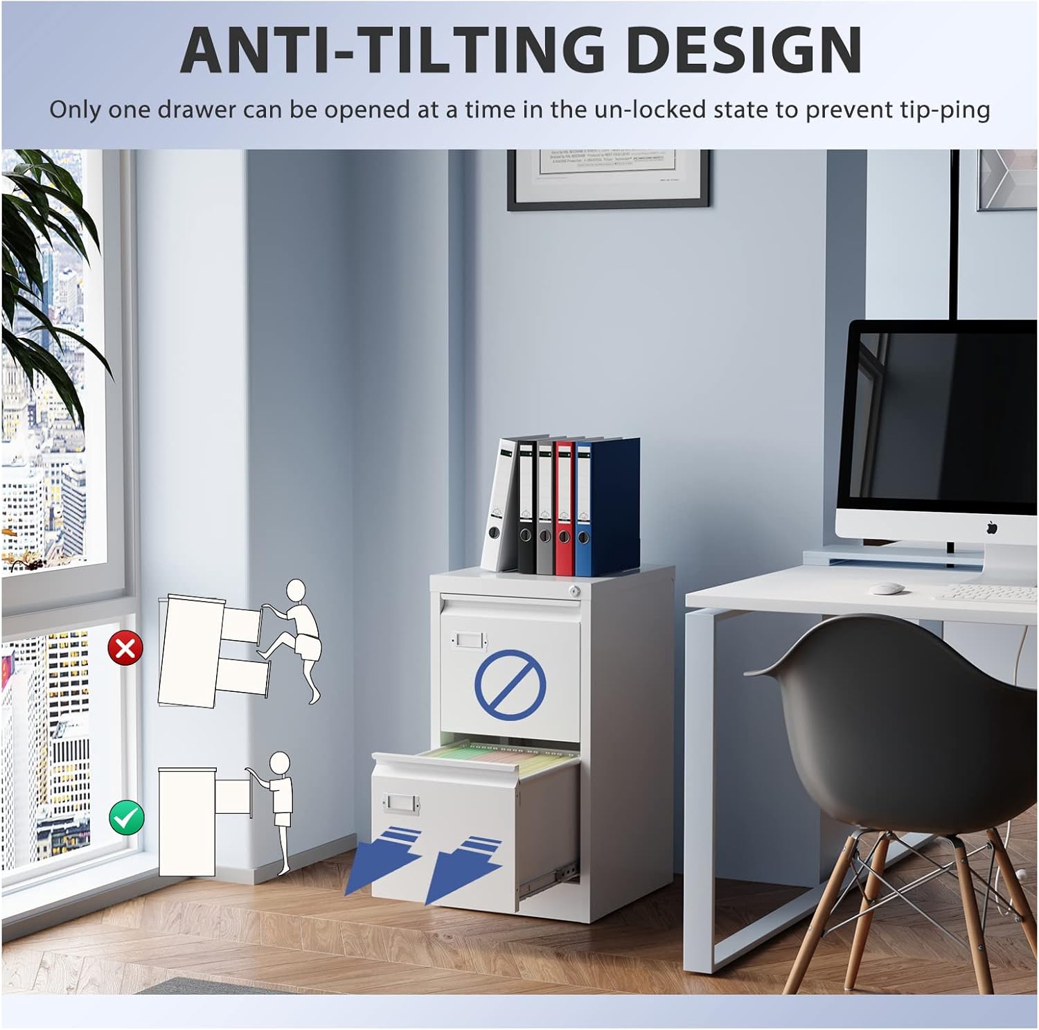 - 【Anti-Tilt Design】This office file cabinets has a lock that can lock all two drawers and comes with two keys. It helps you keep your valuables and documents safe. In the unlocked state, only one drawer can be pulled out at a time, preventing the movement of multiple drawers causing the overall center to shift and the box to fall.