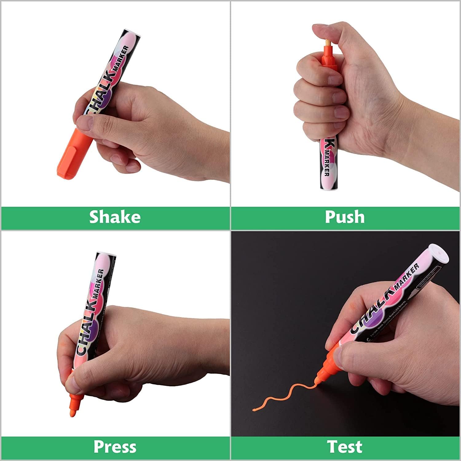 - Prep work before use - Liquid chalk is already a very mature product. Follow the normal steps first you need to shake the body of the pen to let the pigments mix well. Then you need to press the tip of the pen to let the paint flow smoothly. Finally, remove the excess pigment and you can use it normally as a pencil.