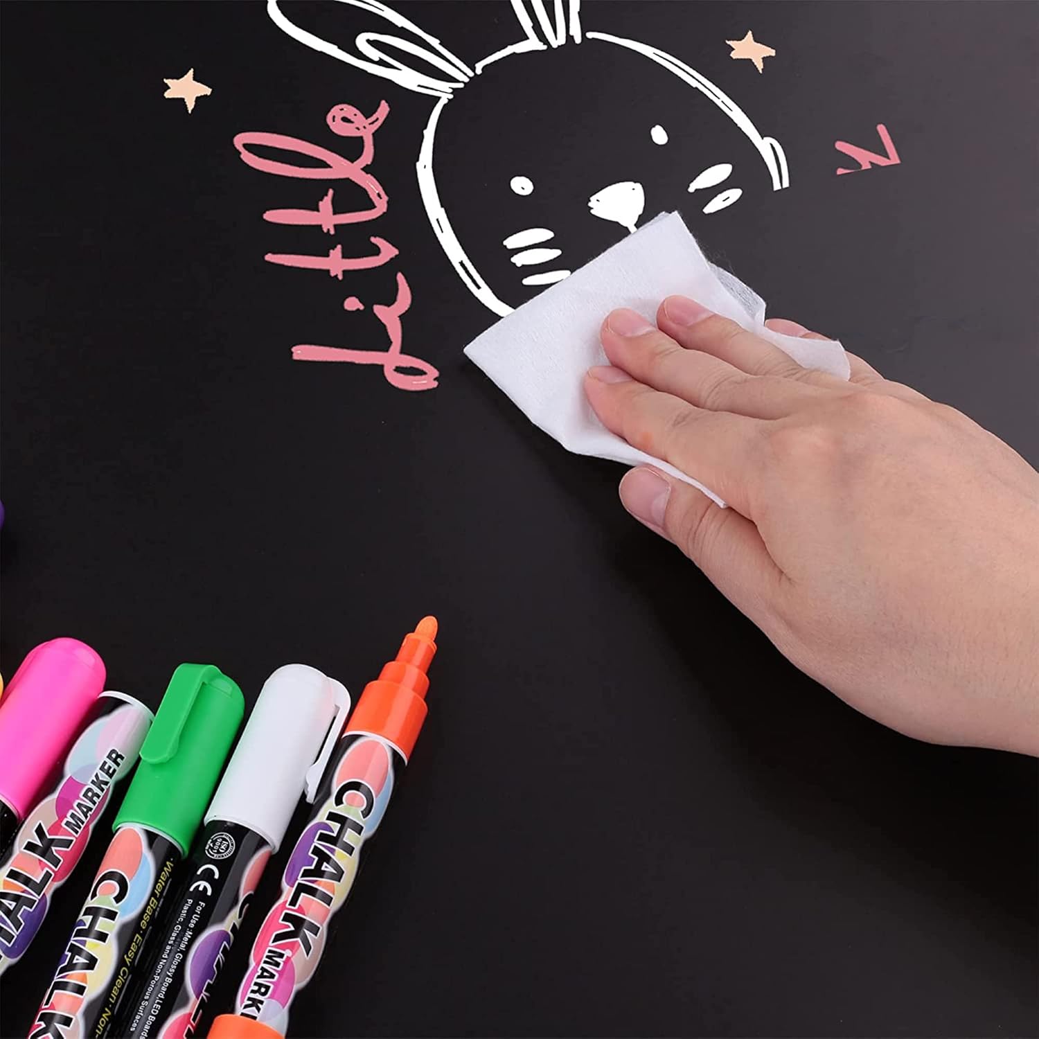 - Erasable & Easy to use - Liquid chalk dries down fast and does not get sticky when writing. It is erasable, you only need to wipe it with a wet tissue or towel when you need to erase it.