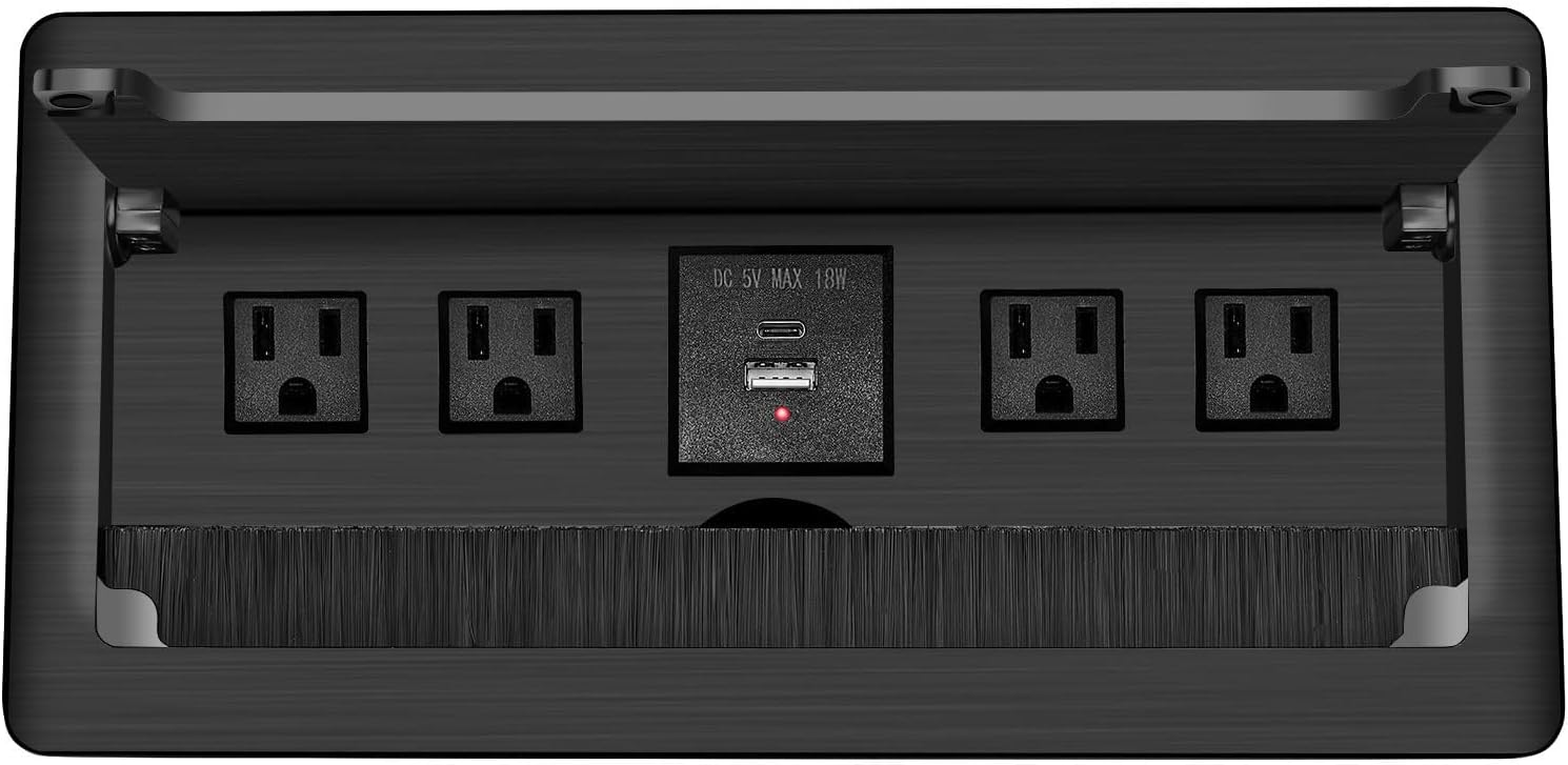 Embedded mesa Power Outlet Box, Table Power Multimedia Connectivity Box for Conference Study Room Home with 4 AC Outlet,USB-C Port Fast Charge 18W Length 4.9FT Power Cable (Brushed Black)