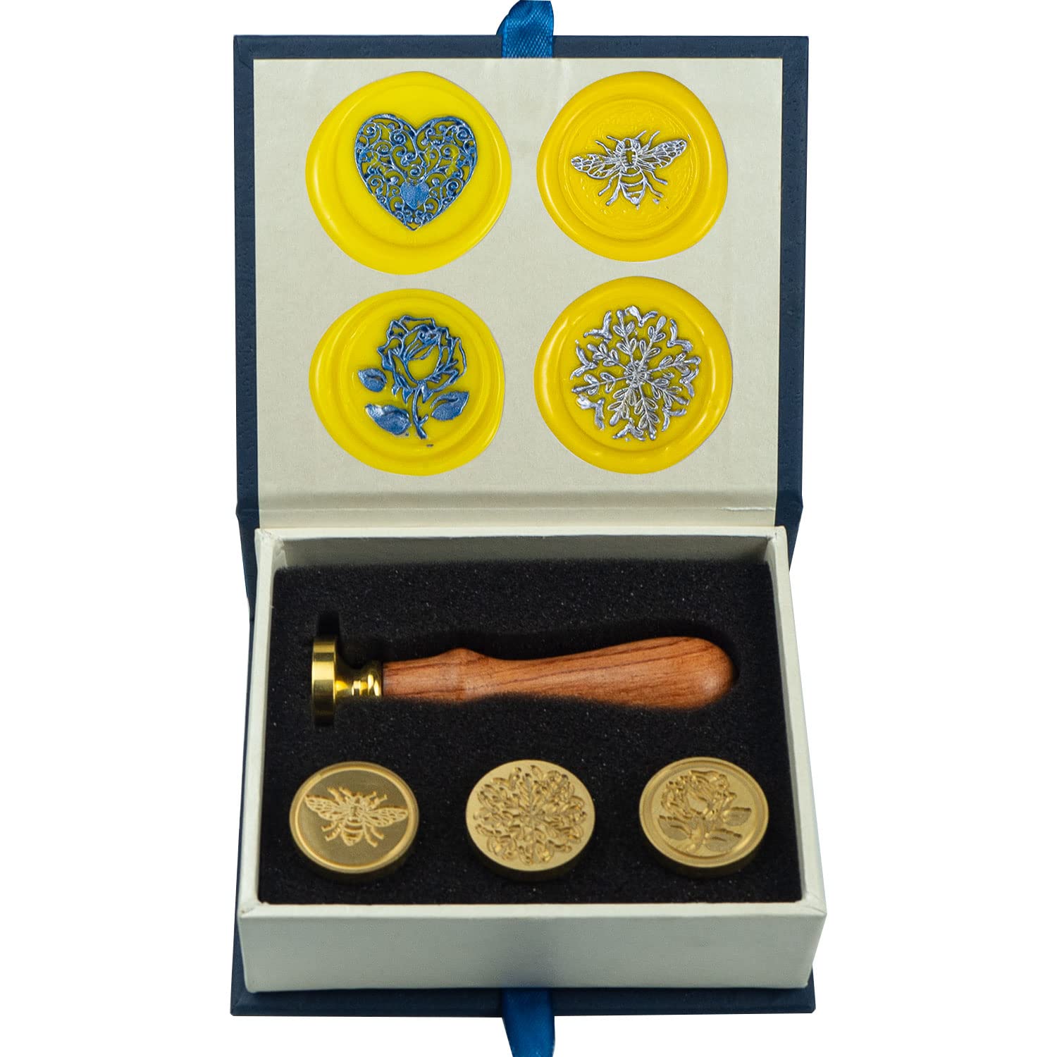 - [Package Includes] ANBOSE wax seal stamp kit includes 1 PCS Wooden handle,1 PCS Heart wax seal stamp, 1 PCS Rose wax seal stamp, 1 PCS Bee wax seal stamp, 1 PCS Flourishing Leaves wax seal stamp and 1 Gift box.