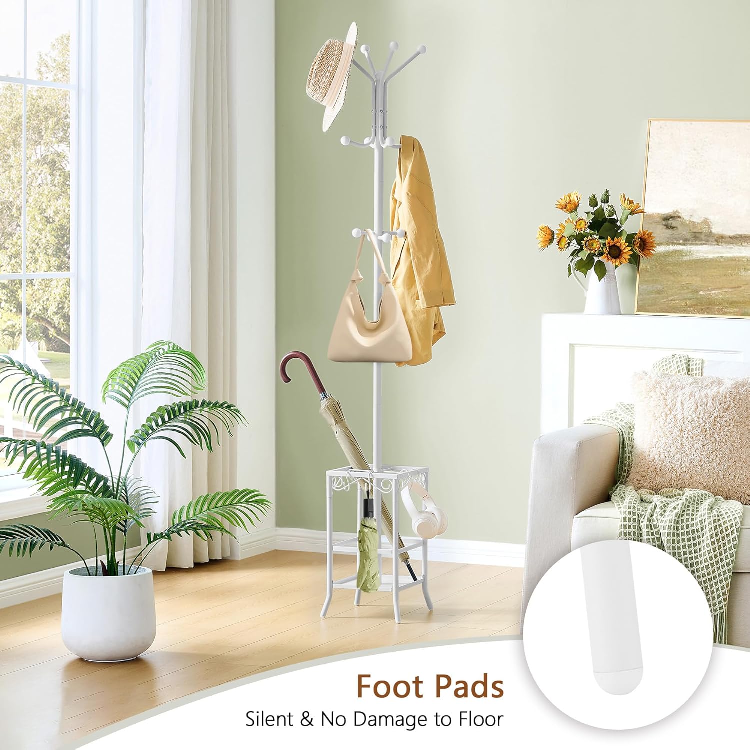 Hoctieon Coat Rack Freestanding, Coat Tree with Umbrella Holder, Metal Coat Rack Stand with 12 Hooks, Standing Coat Hanger Stand, Umbrella Stand for Entryway, Hat Rack Stand for Home Office, White