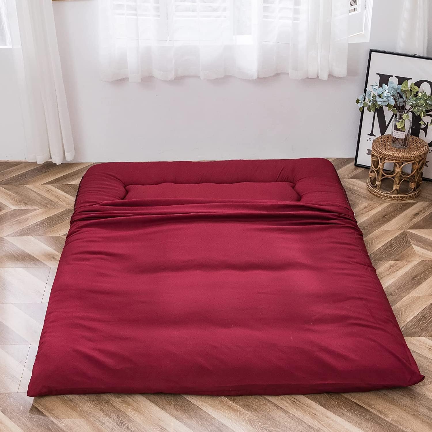 MAXYOYO Japanese Floor Futon Mattress - Thicken Sleeping Pad, Foldable Roll Up Mattress Topper, Guest Floor Bed, Burgundy, Queen