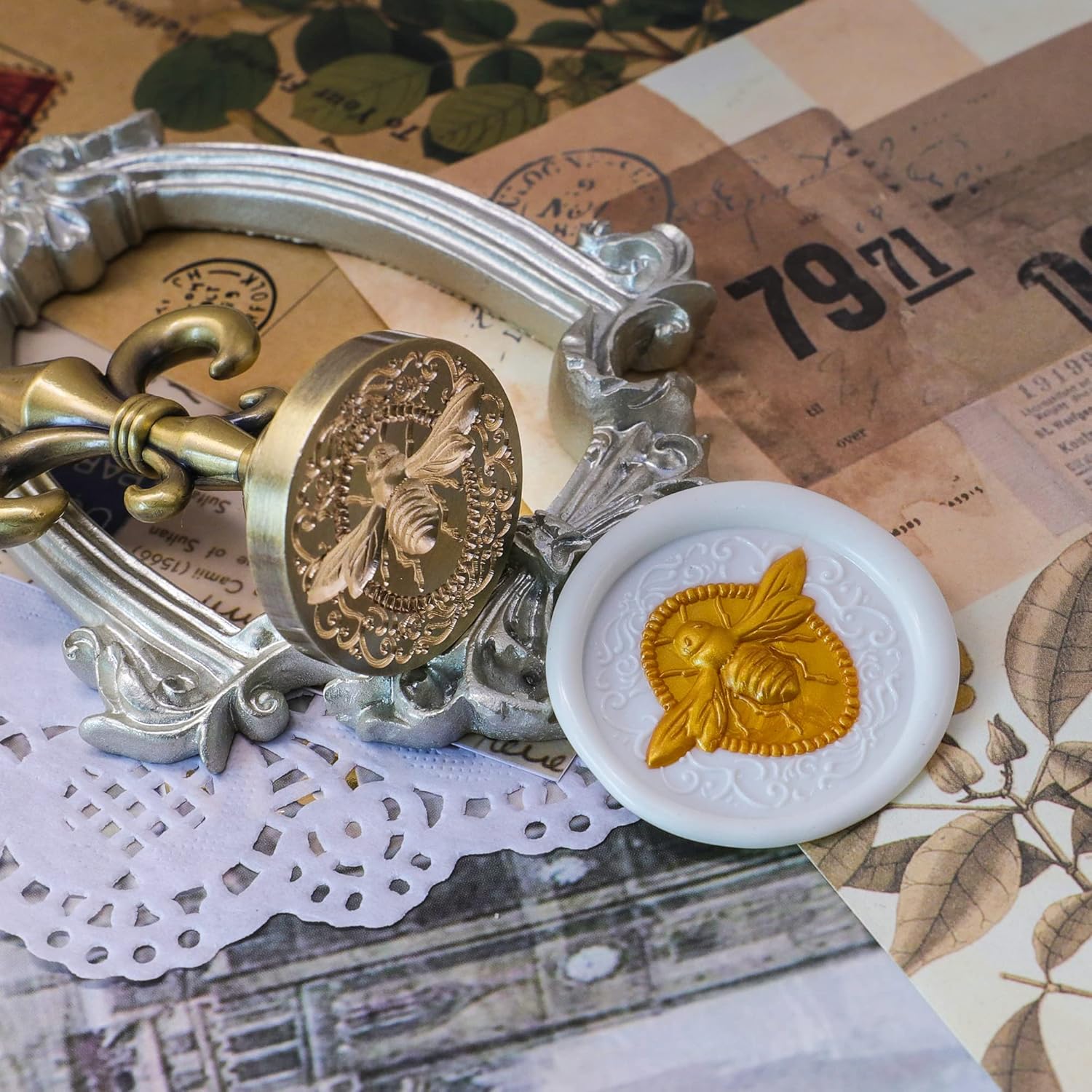 SWANGSA 3D Embossed Bee Wax Seal Stamp, Vintage Electroplated Bronze Flower Handle Sealing Stamp for Wedding Party Invitations Gift Idea Decoration