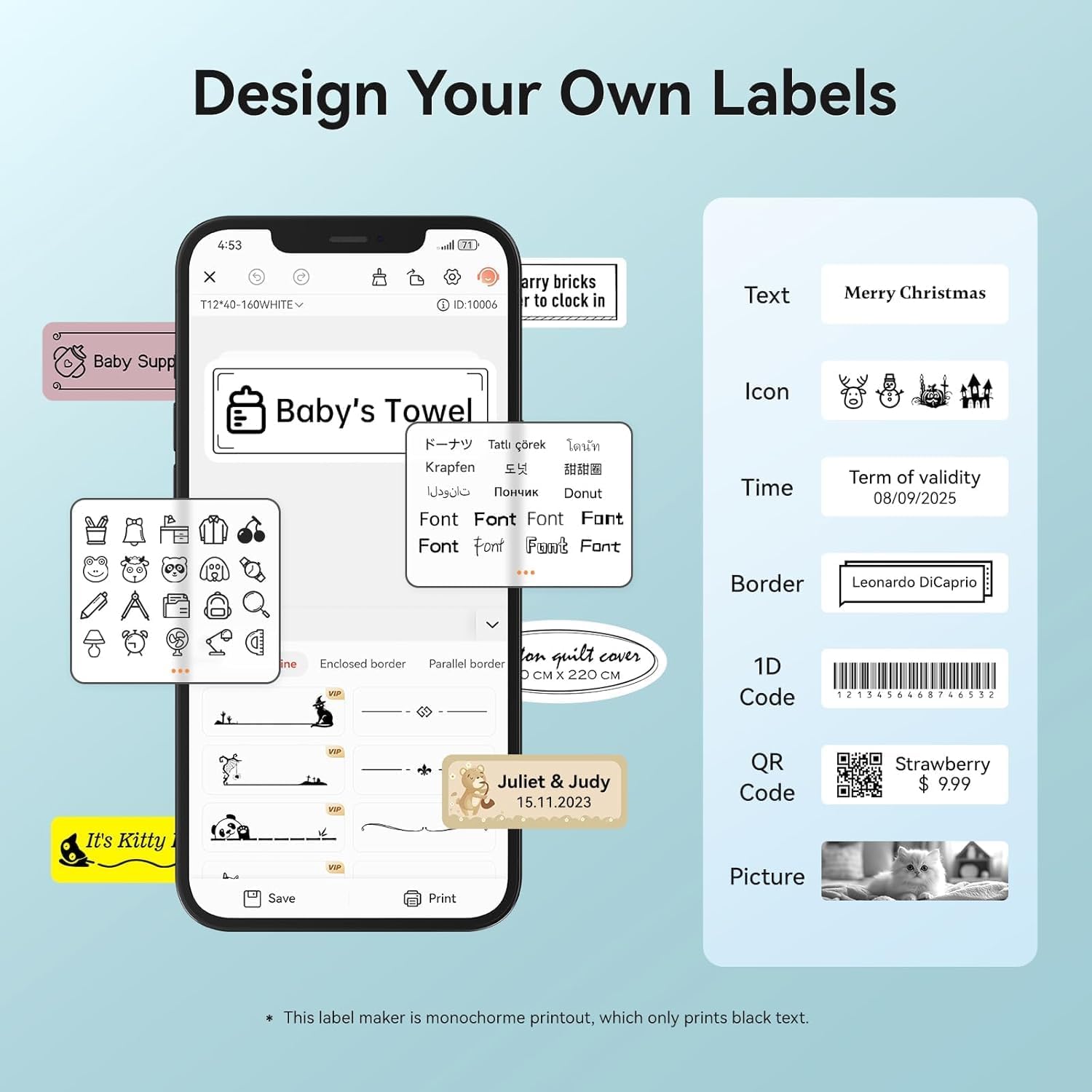 - 【Save Money-No Ink】Print your customized labels through bluetooth connection, our thermal label printer doesn't require ink, toner, or ribbons, save your time and money. Handheld size and wireless connection for convenient daily using, enjoy advanced inkless thermal printing.