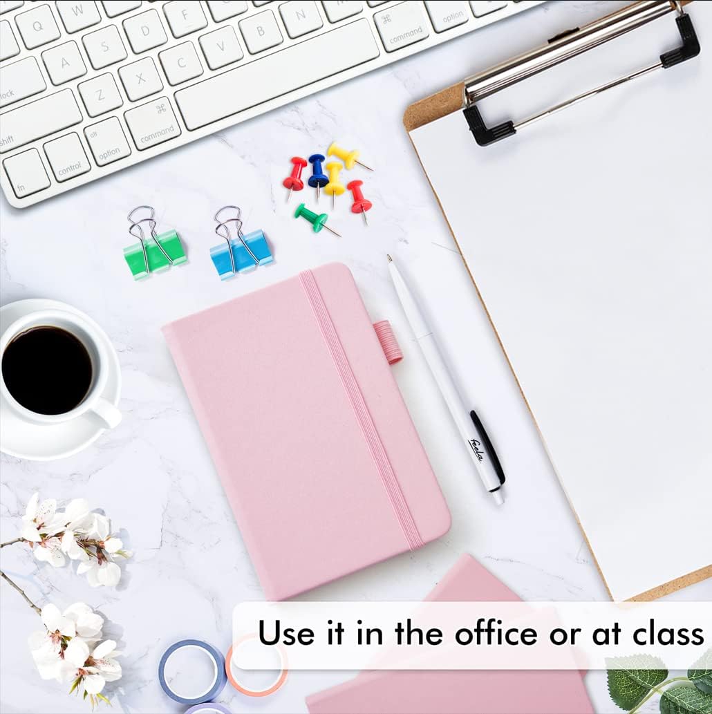 feela 6 Pack Pocket Small Notebooks Bulk, Mini Cute Memo Notepads Hardcover College Ruled Lined Journals with Pen Holder for Women Girls Office School, with 6 Black Pens, 3.5”x 5.5”, A6, Rose Pink