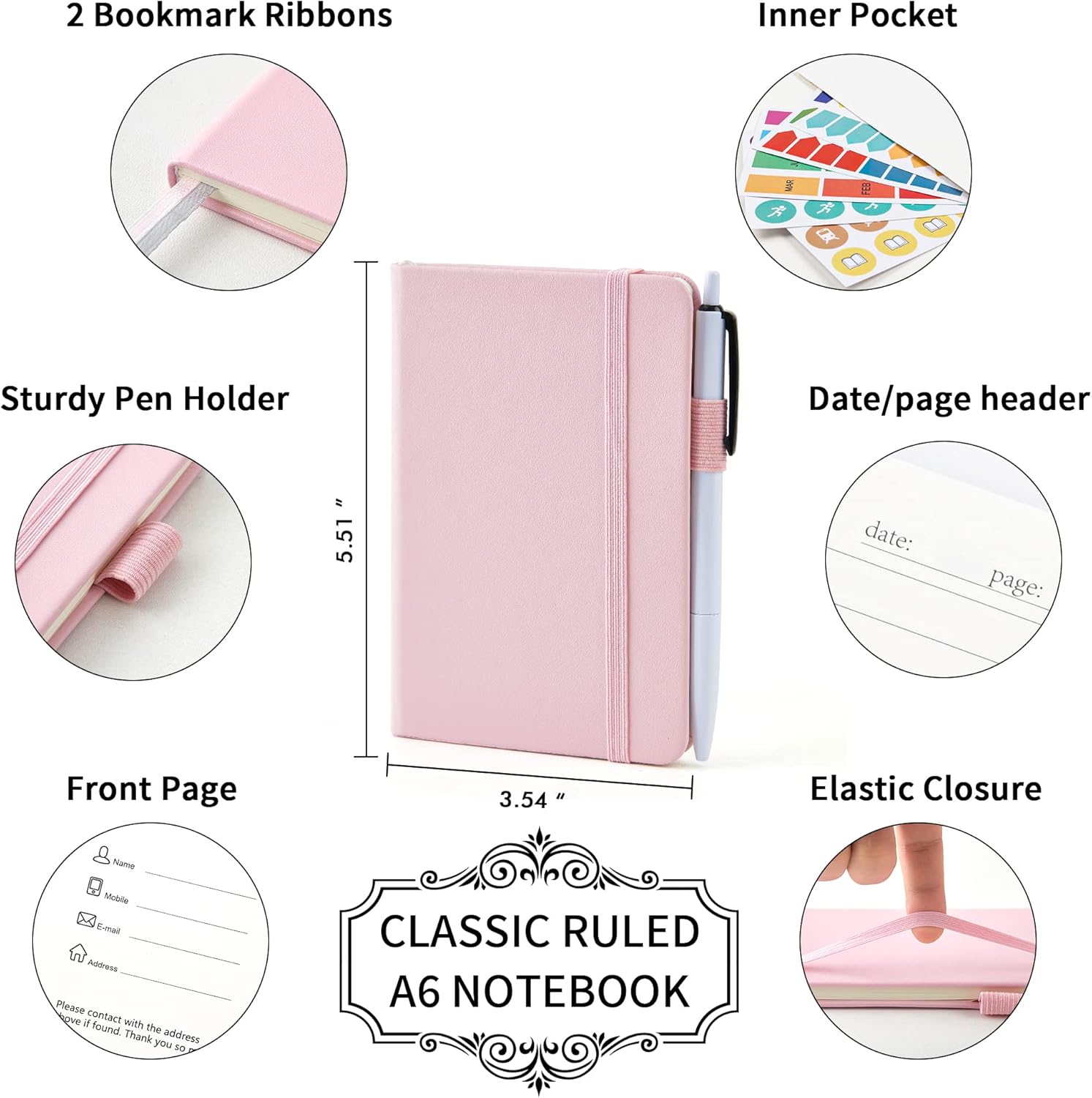 - Feela 6 Pack College Ruled Rose Pink Notebooks contains 6 college ruled sturdy cover notebooks and 6 Black Retractable Pens. Each of the notebooks measures 3.5” x 5.5”, which is perfect to carry and easily held by young girls and boys. These black cute pens are customized to be placed in the pen holder, which is pretty convenient.