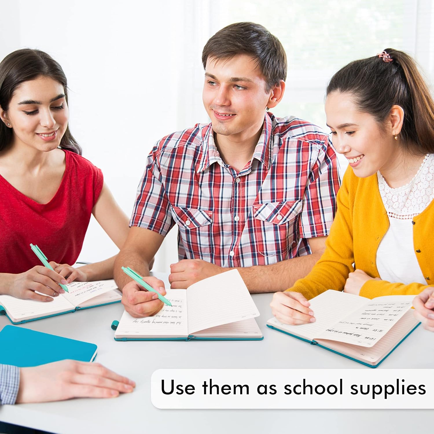 - Feela 12 Pack Classic Ruled Notebooks contains 12 teal ruled sturdy cover notebooks and 12 Black Retractable Pens. Each of the notebooks measures 8.3” x 5.1”, which is perfect to carry and easily held by young girls and boys. These black cute pens are customized to be placed in the pen holder, which is pretty convenient.