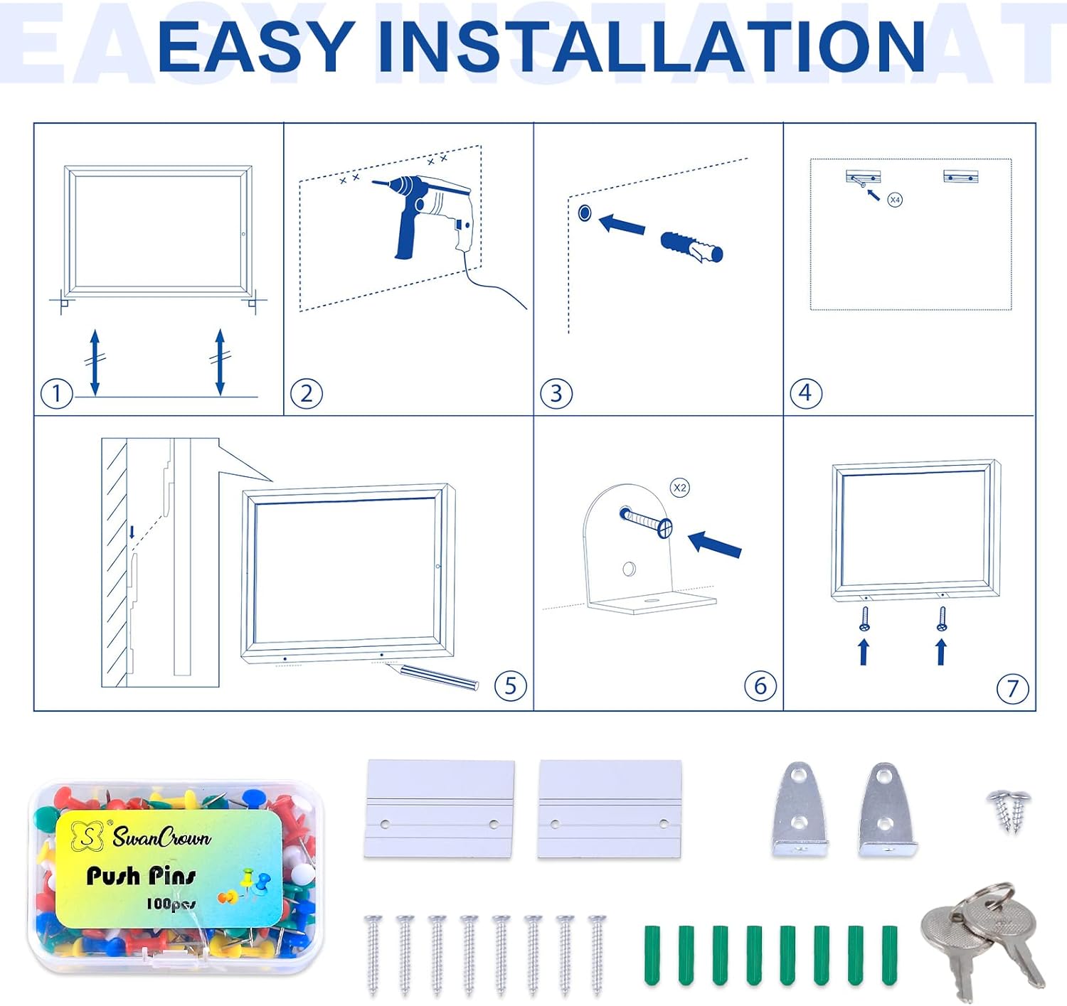 - 💧OUTDOOR USE —Weather resistant cabinet construction features aluminum frame with a satin finish, full-length piano hinges add strength and durability to the door frame. Drainage holes in the bottom and sealed backing means you can mount the board outdoors.