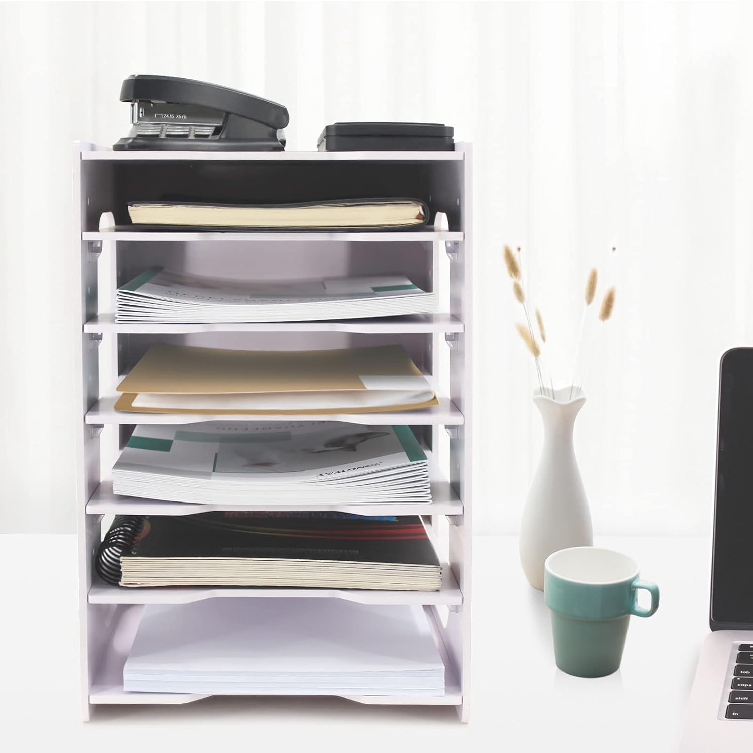 - SUTIABLE SIZE: The assembled file organizer measures about 12''D×10''W×15''H. The updated white desk organizer come with 5 removable tray, you can set up the compartments dimensions as you need, Store different documents by changing the number of tray to build more classification spaces to meet your needs, keep your desk nice and tidy. It is perfect for home, office, school etc