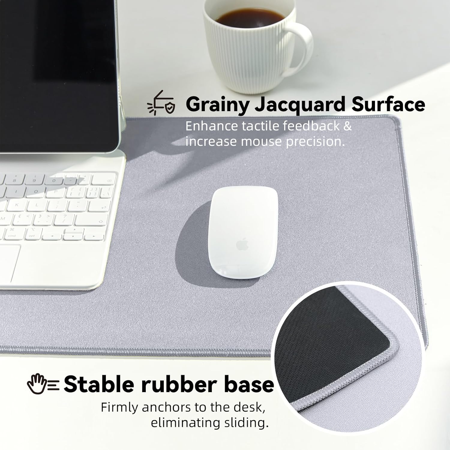 - Grainy Jacquard Surface Design: Utilizing innovative jacquard weaving technology, this mouse pad boasts an elegant appearance. It's designed to enhance tactile feedback, and increase mouse precision.