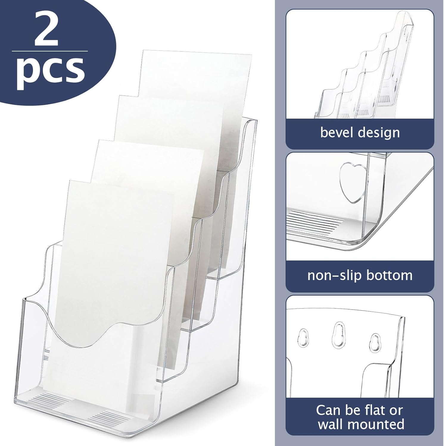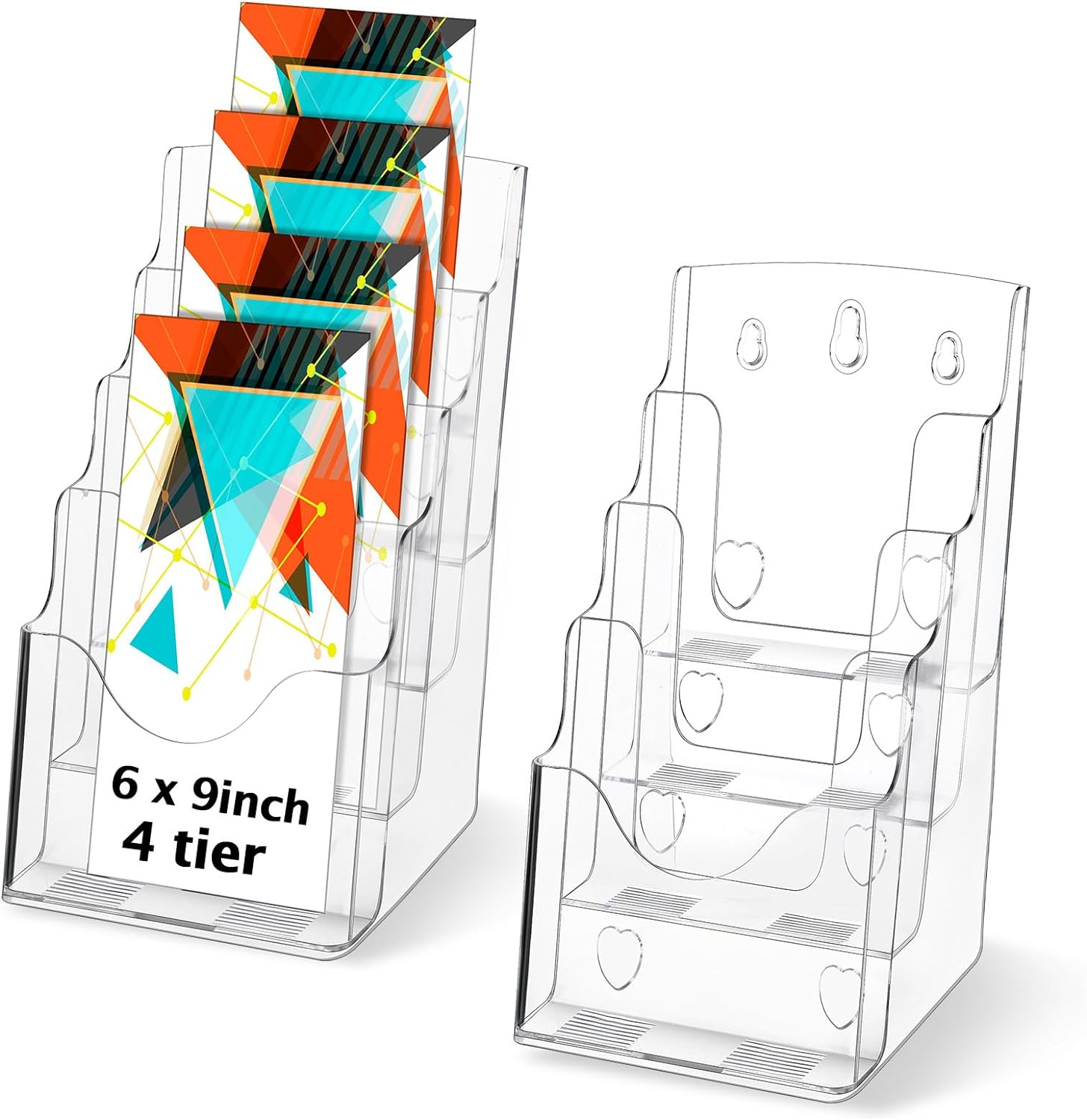 Crtiin 2 Pack 4 Tier Acrylic Brochure Holder Display Stand 6 x 9 Inch, Pamphlet Organizer Flyer Literature Clear Plastic Wall Mount Countertop for Classroom Booklets Magazines Office Home