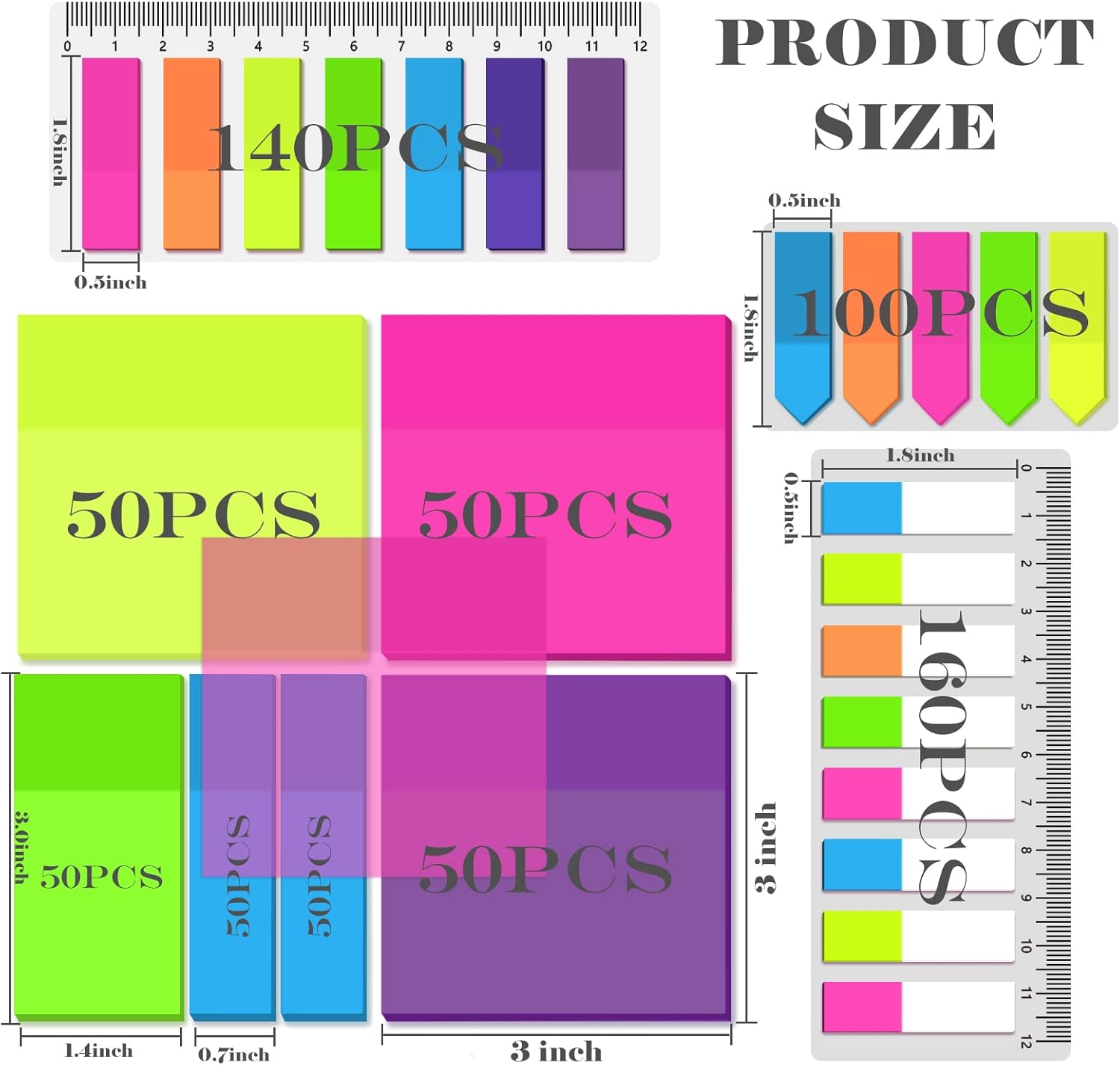 - What Will You Get: 150 Sheets bright transparent sticky notes( 3x3 inch ), 50 Sheets green translucent sticky notes(3x1.4 inch), 100 Sheets blue translucent sticky notes(3x0.7 inch), 400 Sheets bright different colors book tabs(1.8x0.5 inch)