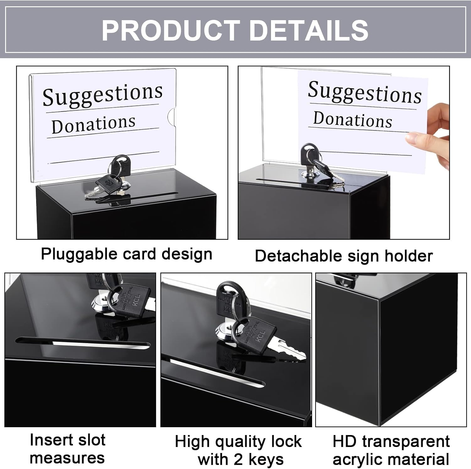 - Applicable for Many Activities: acrylic donation boxes with lock can be widely applied for voting, raffles, fundraising, donating, suggesting, contesting, collecting comments from employees or customers and other activities, they are helpful tools for daily life at home, office or school