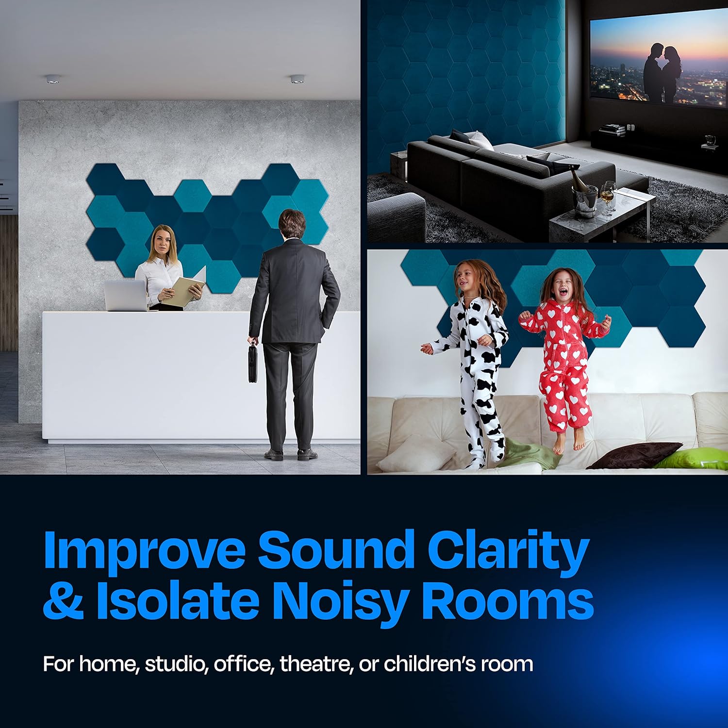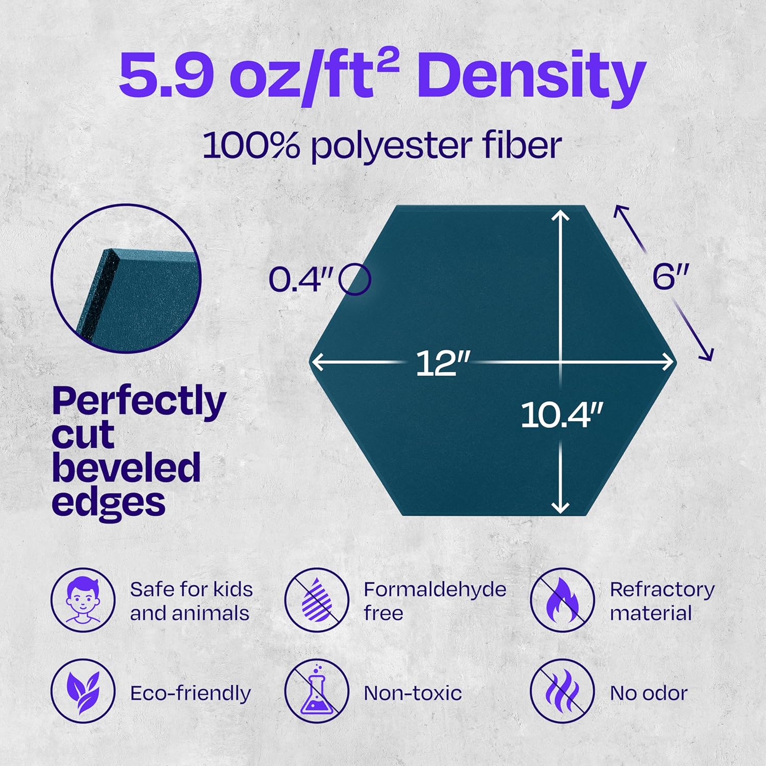 - 【SUPERIOR NOISE REDUCTION PANELS】: Each soundproofing panel is precisely cut of high-density, 5.9oz/ft^2 (1800gr/m^2) poly-fiber panels. Our sound proofing padding for wall reach a NRC rating of up to 0.95, making a big difference to the sounds we hear around us. Pick these hexagon acoustic panels over the old acoustic foam panels and create a beautiful room with superior sound quality.