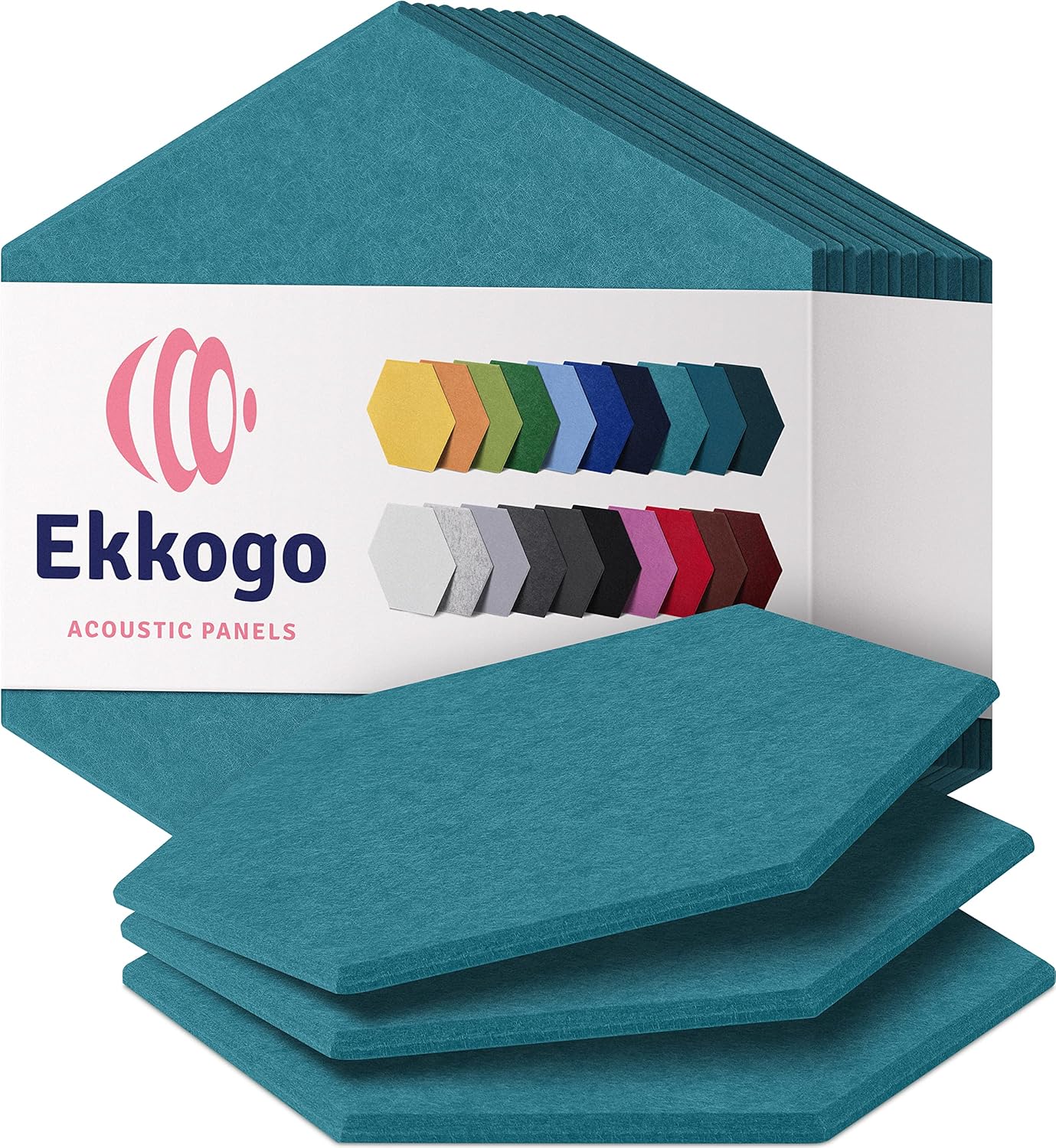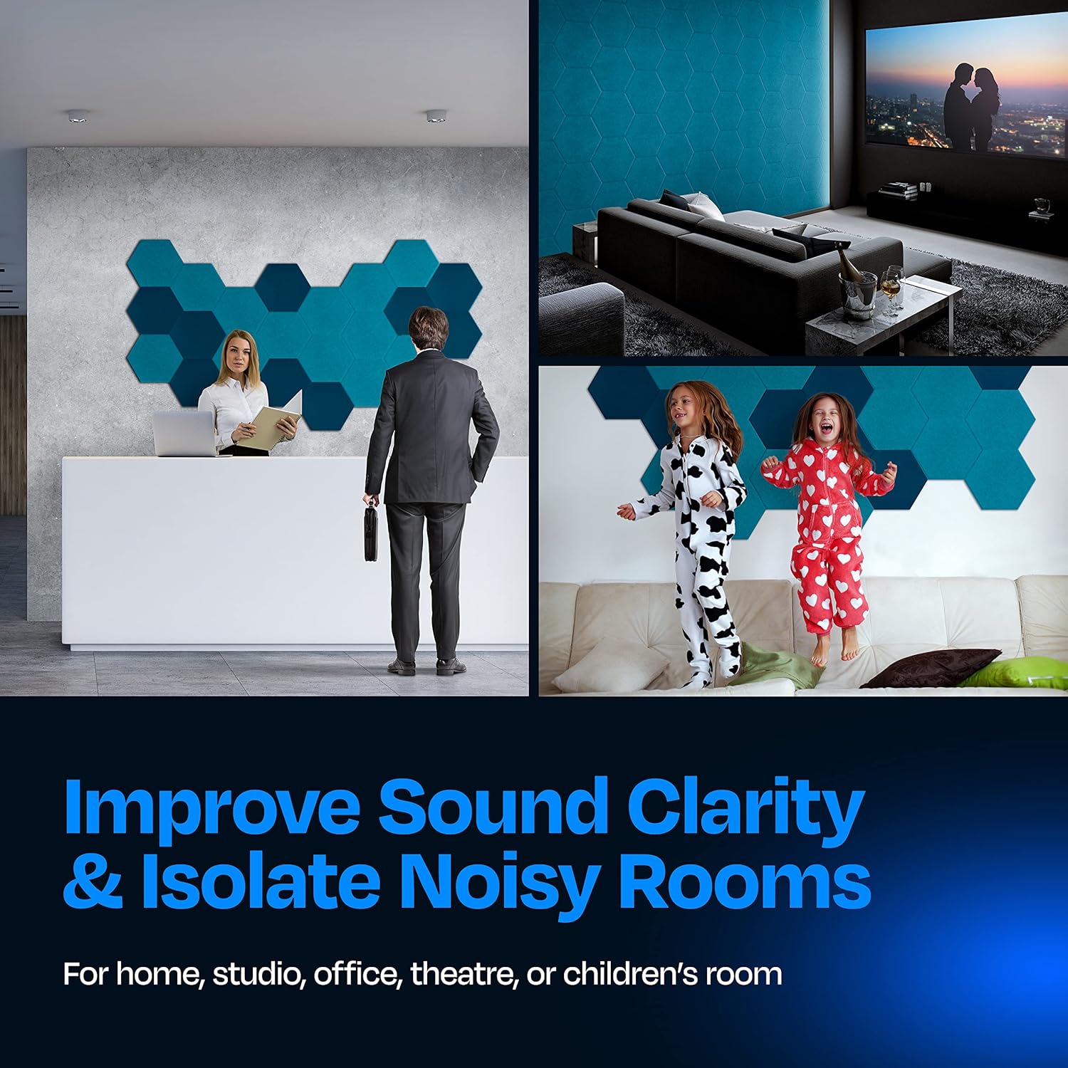 - 【SUPERIOR NOISE REDUCTION PANELS】: Each soundproofing panel is precisely cut of high-density, 5.9oz/ft^2 (1800gr/m^2) poly-fiber panels. Our sound proofing padding for wall reach a NRC rating of up to 0.95, making a big difference to the sounds we hear around us. Pick these hexagon acoustic panels over the old acoustic foam panels and create a beautiful room with superior sound quality.