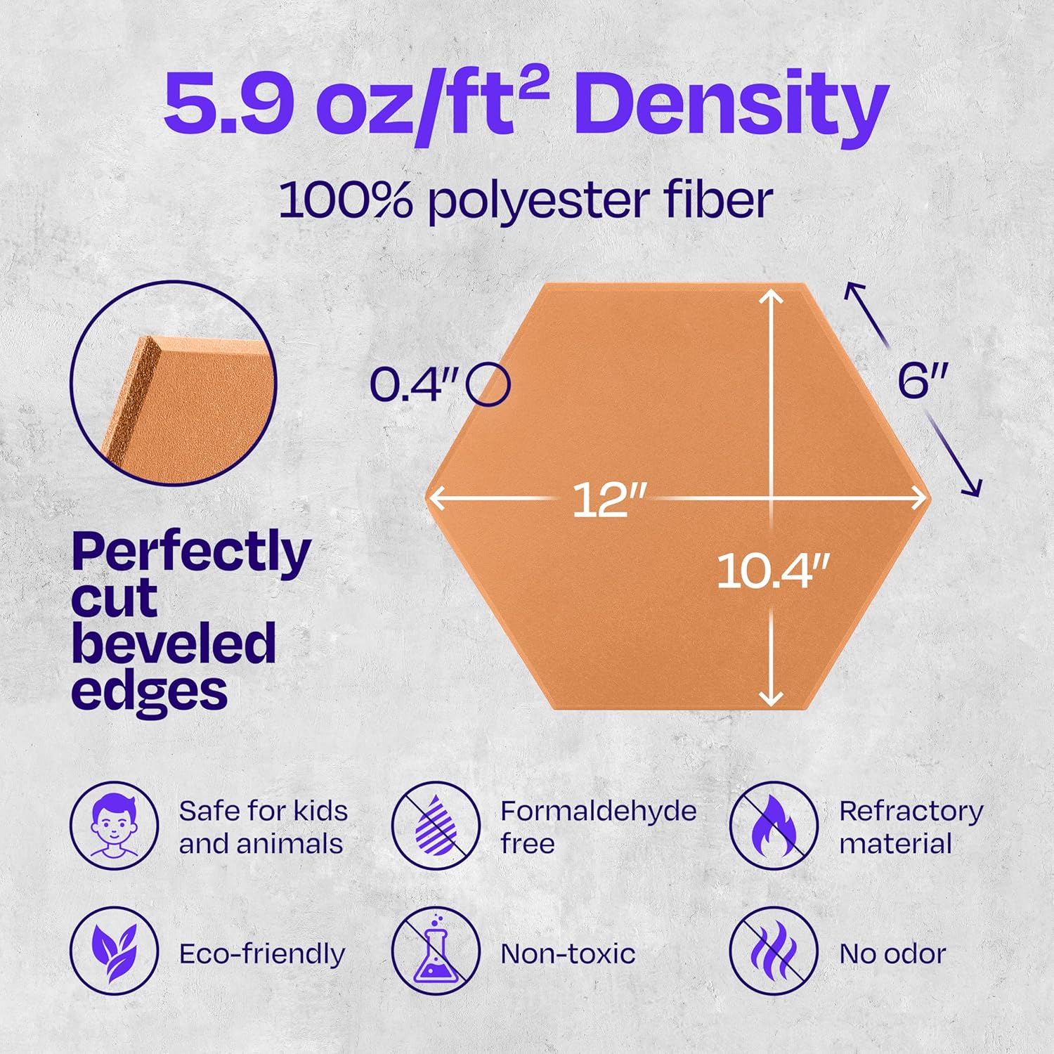 - 【SUPERIOR NOISE REDUCTION PANELS】: Each soundproofing panel is precisely cut of high-density, 5.9oz/ft^2 (1800gr/m^2) poly-fiber panels. Our sound proofing padding for wall reach a NRC rating of up to 0.95, making a big difference to the sounds we hear around us. Pick these hexagon acoustic panels over the old acoustic foam panels and create a beautiful room with superior sound quality.